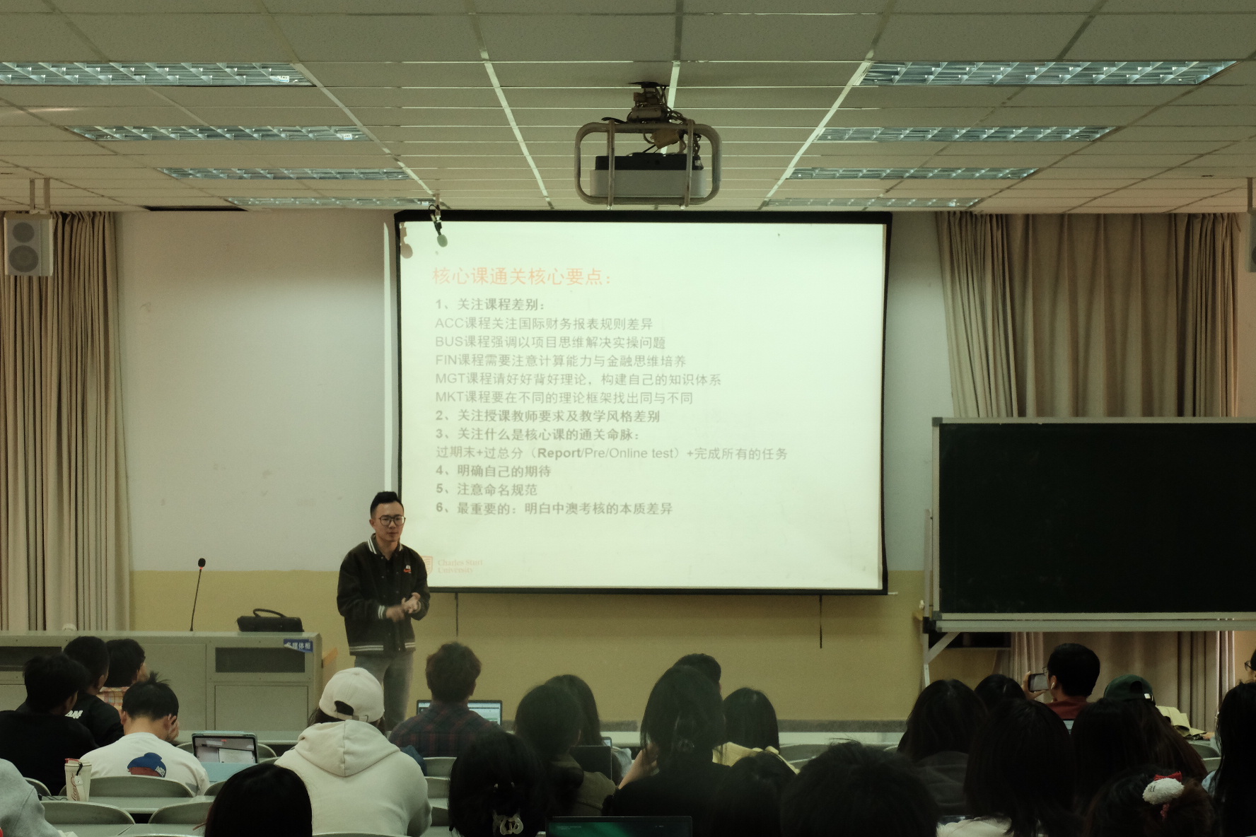 下午,李燕在凌云楼南附301教室给中澳合作项目2021级和2022级学生举行核心课专题讲座。她从课程设置、学习方法、学生系统等方面进行详细介绍,鼓励学生们认真学习,提升自身专业技能,努力修读课业。李燕还介绍了中澳海外留学免费交换生项目,该交换项目不仅增强了学生对就读中澳合作办学项目的信心,同时也鼓励和激发了学生赴澳求学的积极性。