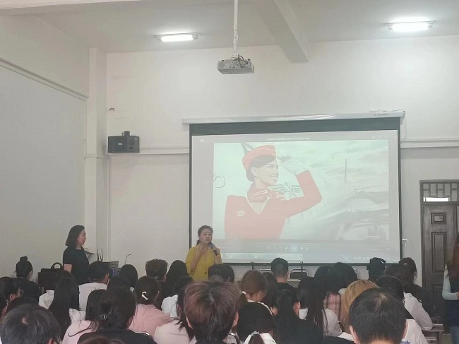 在宣讲会上,企业方组织学生观看了航空公司介绍视频,工作人员结合自身工作经历讲述了空中乘务员、地勤人员的工作发展情况,讲解了航空公司各部门的工作内容、招聘要求等。企业对有意向的同学开展了现场招聘。