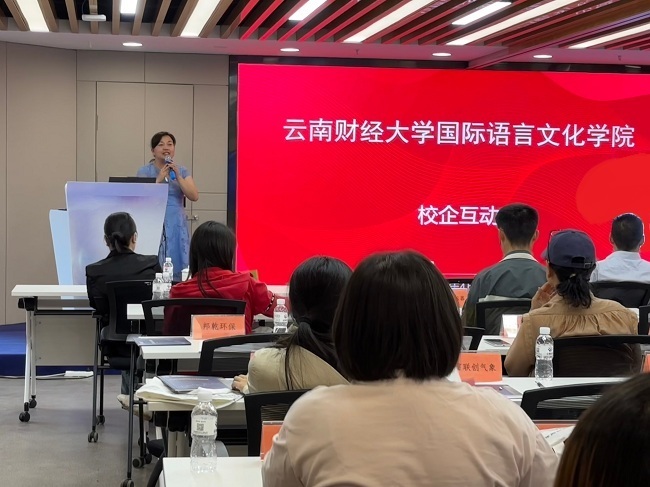 云南省股权交易中心、云南生物制药产业集群公共服务窗口平台、昆明高新技术产业集群公共服务窗口平台、昆明腾洋光学仪器有限公司、云南数智云科技有限公司、云南如茨生物科技有限公司、云南精准检验有限公司、云南瑞克生物技术有限公司、云南邦乾环保科技有限公司、云南贺尔思细胞生物技术有限公司、云南中宜本草生物科技有限公司、云南新锐和达信息产业有限公司、云南侨通包装印刷有限公司昆明分公司、云南亚巨科技有限公司、昆明同创网络科技有限公司、云南云雷联创气象科技服务有限公司、昆明克林轻工机械有限责任公司、云南西力生物技术股份有限公司、昆明思安生物科技有限公司、云南联横利众科技有限公司、昆明荣者光电科技发展有限公司、昆明玖雍文化发展有限公司、文堇艺禾商务咨询有限公司、云南通变电器有限公司、云南安防科技有限公司等企业代表,国际语言文化学院学生管理科科长王芳、辅导员李良辉及7名学生代表参加宣讲洽谈活动。
