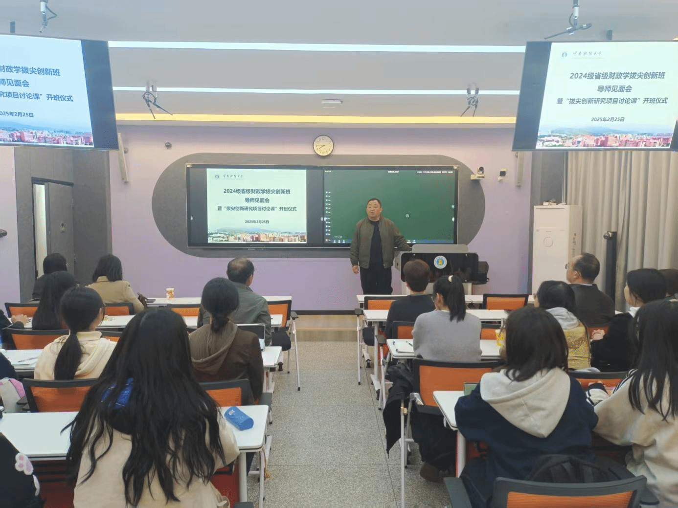 2月25日,2024级省级财政学拔尖创新班导师见面会暨“拔尖创新研究项目讨论课”开班仪式在凌云楼203举行,财政与公共管理学院院长缪小林、副院长和立道、导师团队以及省财班全体同学参加见面会,会议由财税系系主任暨班主任闻勇主持。