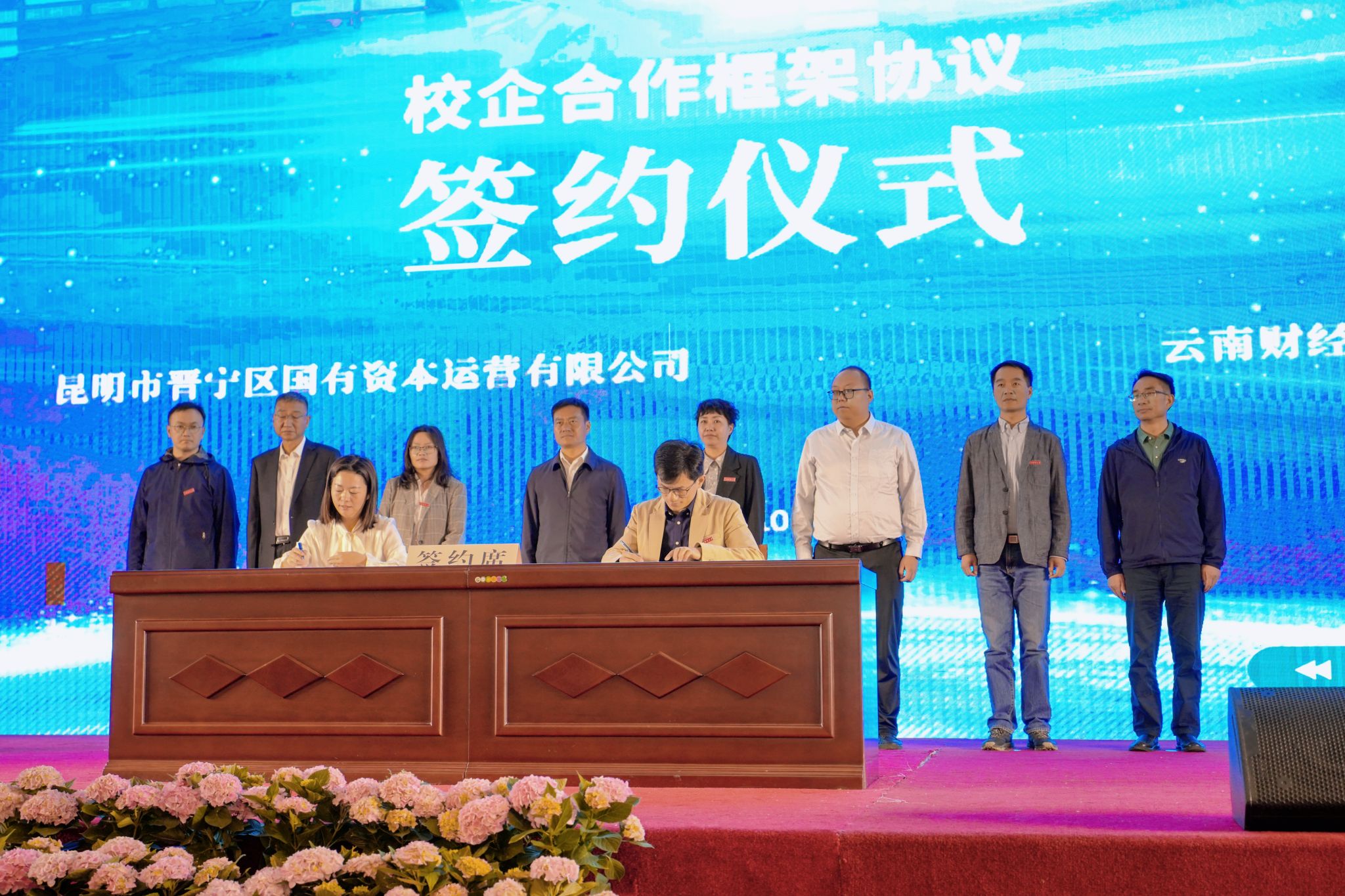 5月10日上午,金融学院与昆明市晋宁区国有资本运营有限公司校企合作框架协议签约仪式暨金融知识专题讲座举行。金融学院党委书记胡小珊、院长周伟,副院长李云仙、杨国辉和李江城,晋宁区区长李松、国有资本运营有限公司董事长杨鸿飞和副总经理聂海艳、区政府办主任韩通、区财政局局长王德伦、区商务和投促局局长钱玉玮、区国资运营服务中心主任李自坤及区国资公司班子成员参加签约仪式。