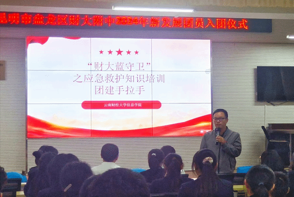 为提升学生群体的应急救护能力,5月20日晚,十大买球官方网站信息学院青年志愿者协会与盘龙区财大附中联合举办了“财大蓝守卫”应急救护知识培训暨团建手拉手活动。财大附中党总支书记普川、党总支副书记陈海星、团委书记周潘蕊、70名团员代表,以及信息学院党委副书记李卫东、团委负责人徐丹妮及青协9名学生志愿者参加活动。