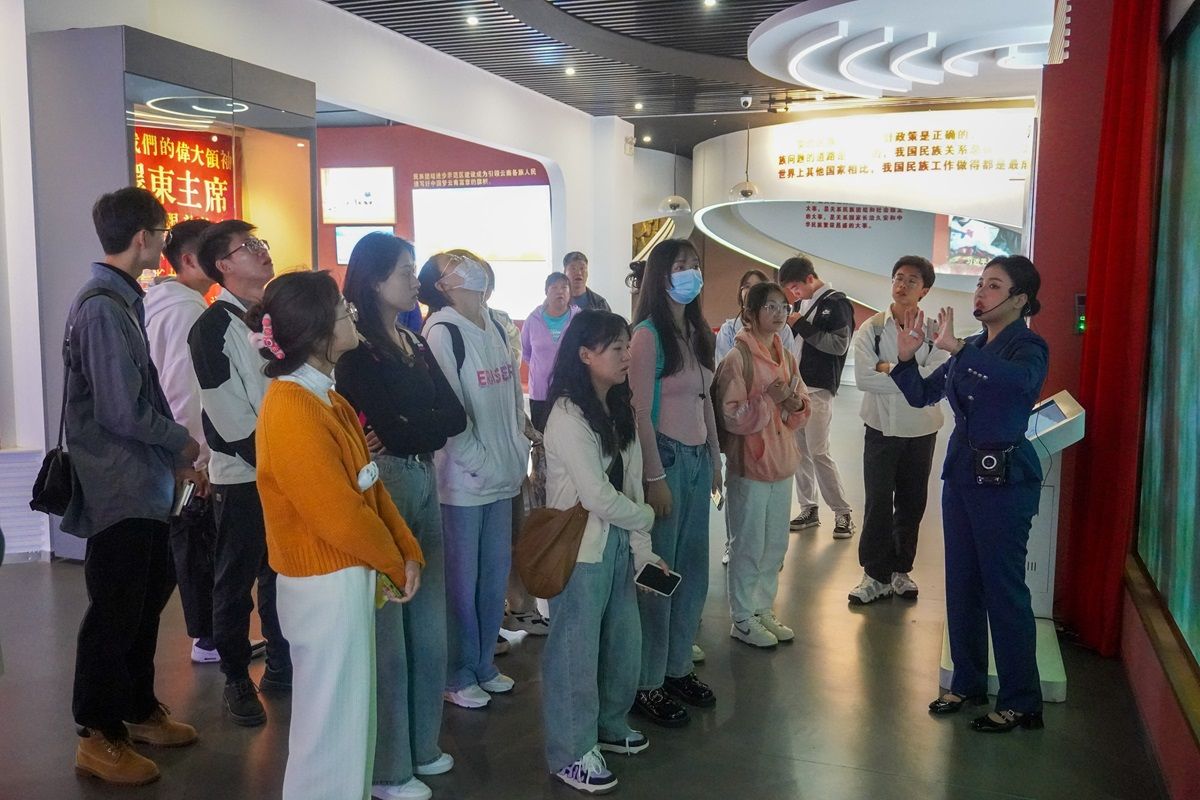 专业的讲解引导学生讲解员们参观了云南民族分布馆、民族团结誓词碑、直过民族的社会发展、少数民族民间工艺品展示以及风俗习惯、民族文化等非物质文化遗产的保护传承、云南立体气候分布等展陈内容。在介绍云南以及云南民族特色的同时,刘桢将讲解中可能出现的突发情况、各展厅之间的串讲方法、观众的情绪和互动的调动,以及讲解员在实战中的心态和对细节的观察、把控处理等技巧进行了现场教学,特别提醒同学们要注意诸如讲解中的语气、情绪的调动、场馆内秩序的维护等方面。