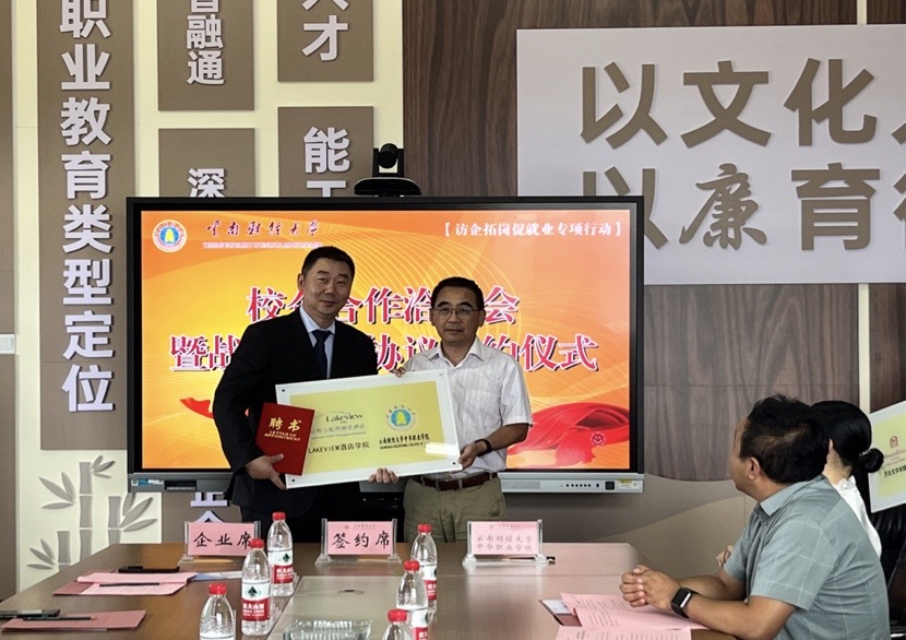 7月20日下午,中华职业学院在修远楼512会议室与云南花腰傣开元森泊度假乐园、昆明滇池宋品酒店、昆明玉龙湾湖景酒店、昆明富力万达文华酒店、昆明洲际酒店、昆明华邑酒店、昆明中心皇冠假日酒店、昆明中心假日酒店、昆明古滇名城皇冠假日酒店、昆明迪肯商贸有限公司等10家企业举行校企合作洽谈会。校党委委员、副校长胡海彦为各企业授牌并颁发证书,院长李小军与企业代表签订战略合作协议。会议由学院党委书记保伟主持。