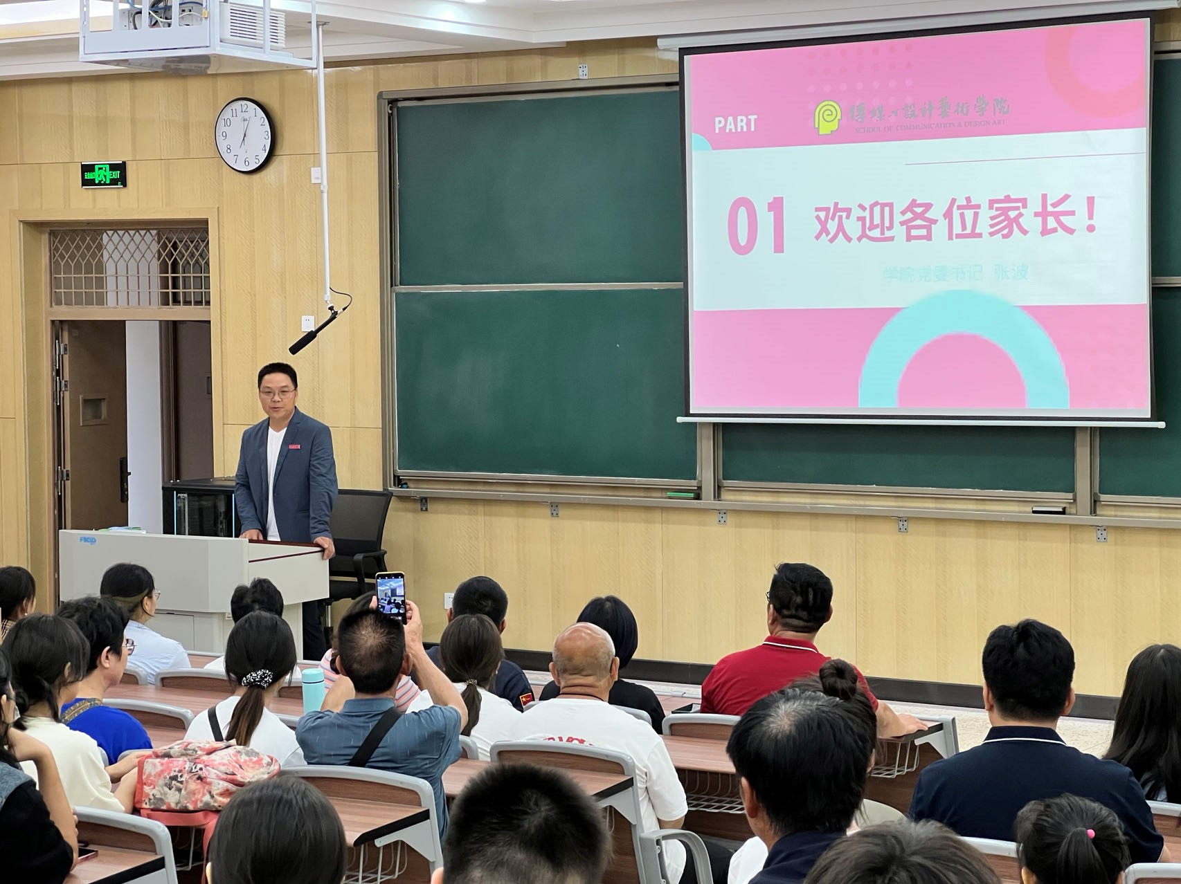 8月26日晚,传媒与设计艺术学院新生家长见面会在鹏云1栋111举行。学院党委书记张波,院长袁洪,党委副书记兼纪委书记杨青山,副院长李晶、崔木扬、李楠,学生科长黄思佳、团委书记谢天娇、全体新生班主任及200余名新生家长参加见面会。会议由杨青山主持。