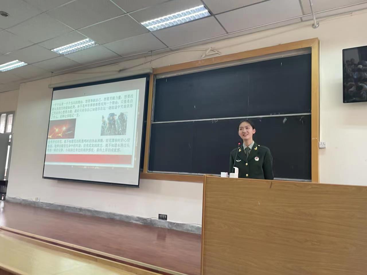 三位宣讲员分享了各自的军旅生活,讲解了大学生参军入伍优惠政策,燃起青春学子的戎装梦。同学们聚精会神地倾听宣讲员的热血回忆,不时响起阵阵掌声。从“为什么要当兵”到“当兵的一千个理由”,从“大学生参军入伍优惠政策”到“退伍优待”等,话题一个接一个,气氛一次又一次被点燃,同学们认识到参军入伍不仅是祖国的感召,更是一份光荣的责任与义务。谈到当兵感受时,优秀退役大学生黄勇自豪地说:“第一次紧急集合、第一次实弹射击、第一次答到、第一次立功受奖、第一次执行任务……它们终将成为我一生最为骄傲的回忆。去部队,你将收获最骄傲的经历。”