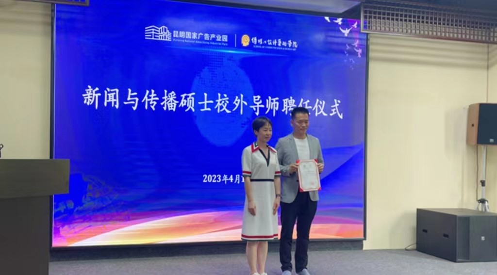 座谈会上,吕承鸿和倩莹就整个昆明广告产业园的概况向学院师生做了介绍,分享了园区建设情况、园区运营模式及经验等。袁洪为吕承鸿颁发新闻与传播(专业)硕士校外导师聘书。吕承鸿表示,昆明国家广告产业园将充分发挥园区的市场、技术、资源等优势,深化“双园(校园与产业园)、双业(专业与企业)”合作,为学院学生实践、实习、见习、就业、创业提供针对性、精准性的服务工作,提升学生的就业能力,拓宽就业渠道,夯实创业基础。同时,产业园将深化与学院的合作,构建产教融合育人平台,探索产教融合创新发展的路径。