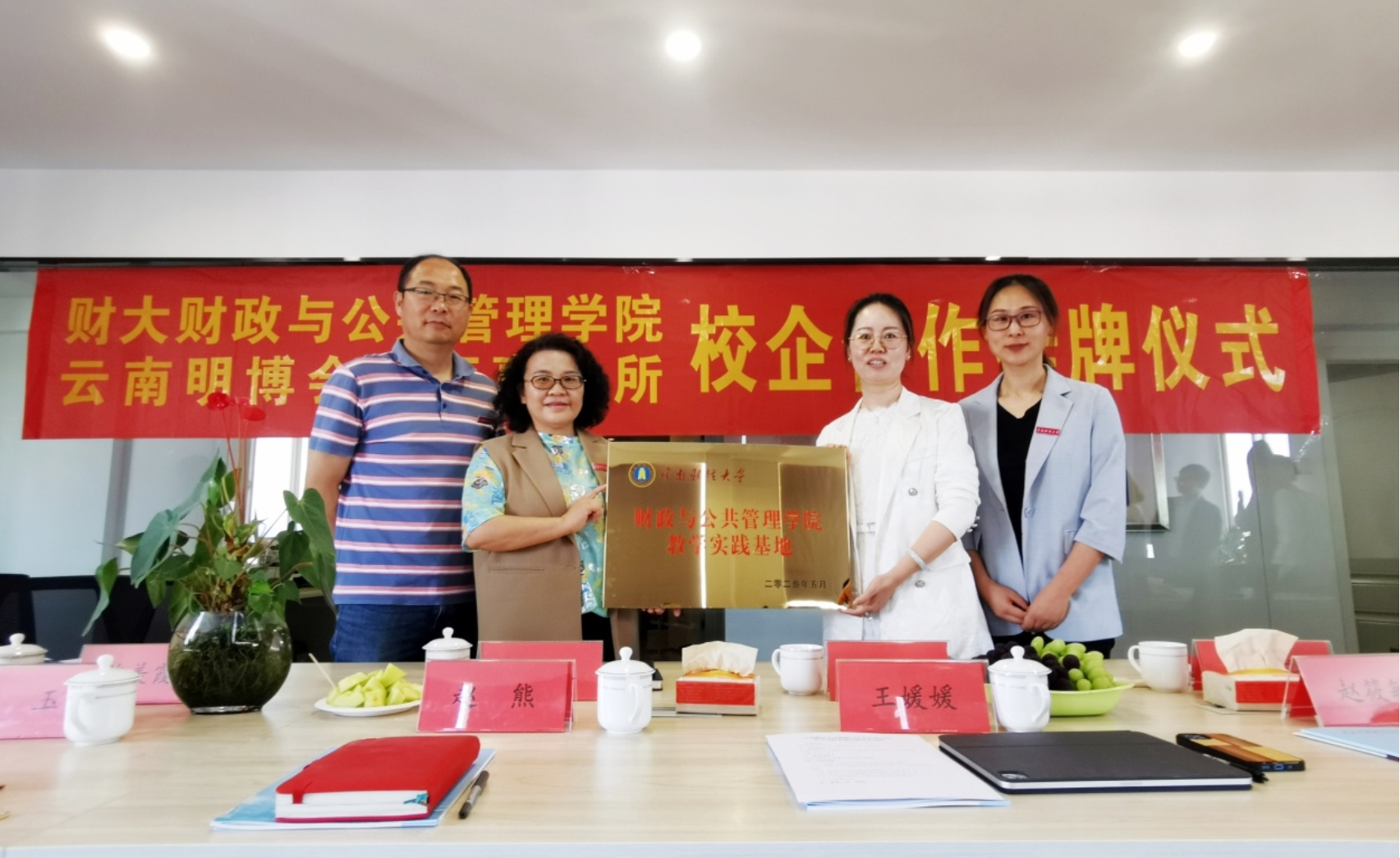 5月18日上午,财政与公共管理学院党委书记荣小红、党委副书记王晓芬、副院长和立道一行赴云南明博会计师事务所开展访企拓岗调研活动,同时双方举行“财政与公共管理学院教学实践基地”挂牌仪式。