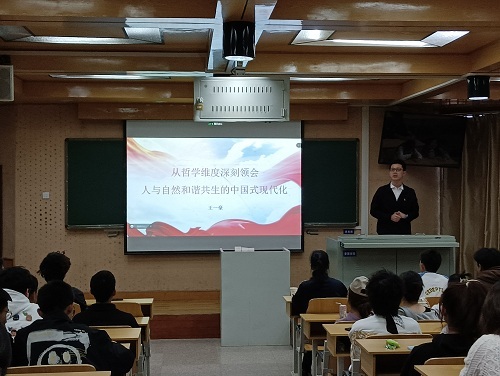 王一豪以“从哲学维度深刻领会人与自然和谐共生的中国式现代化”为题,从本体论、认识论、价值论三个维度阐述了人与自然和谐共生的中国式现代化的哲学依据。他带领同学们从党的二十大报告中,重点体会习近平总书记对新时代十年来我国生态环境方面发生的重大变化做出系统总结和科学论断。这一总结向全世界证明了新时代中国共产党人对于实现现代化与生态化双赢的价值取向和使命担当,更体现出新时代中国共产党人对于人类文明新形式的深刻思考。