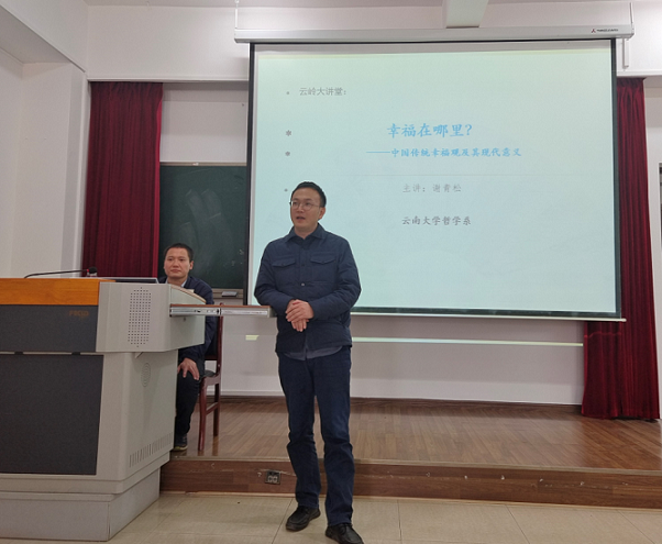 3月10日上午,买球“2023年云岭大讲堂第一讲”在金融学院103会议室举行,邀请云南大学研究员、博士生导师谢青松教授开展“幸福在哪里?—中国传统幸福观及其现代意义”的专题讲座。讲座由金融学院副院长李江城主持,学院老师、研究生及学生干部80余人参加。