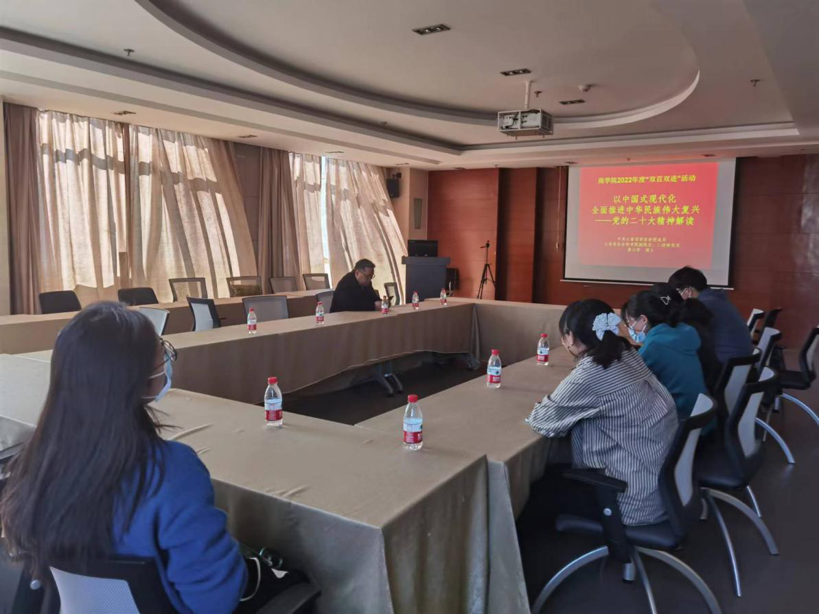 为进一步提高师生思想政治理论水平,推动党的二十大精神的贯彻落实贯穿学院高质量建设的全过程,12月8日,商学院举行“双百双进”活动。云南省社会科学院、中国(昆明)南亚东南亚研究院党组成员、副院长,习近平新时代中国特色社会主义思想研究中心常务副主任黄小军博士应邀以“以中国式现代化全面推进中华民族伟大复兴——党的二十大精神解读”为题做专题讲座。讲座以“线下+线上”方式举行,商学院党委书记王敏主持线上讲座,党委副书记蒋见证在南院逸夫楼521会议室主持线下收听收看。商学院300余名师生参加学习。