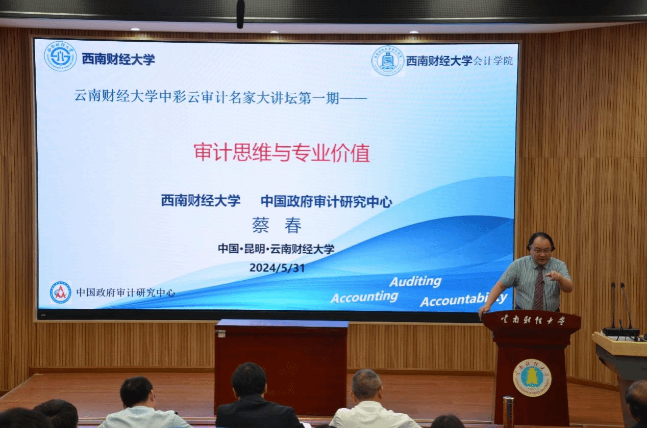 5月31日,审计学院首期“中彩云审计名家大讲坛”在行远楼D101报告厅举行。中国审计学会副会长、西南财经大学中国政府审计研究中心主任、二级教授、十大买球官方网站审计学院名誉院长蔡春教授应邀以“审计思维与专业价值”做讲座。会计(审计)学院院长陈永飞、党委书记李丽忠、副院长纳超洪等100余名师生参加。