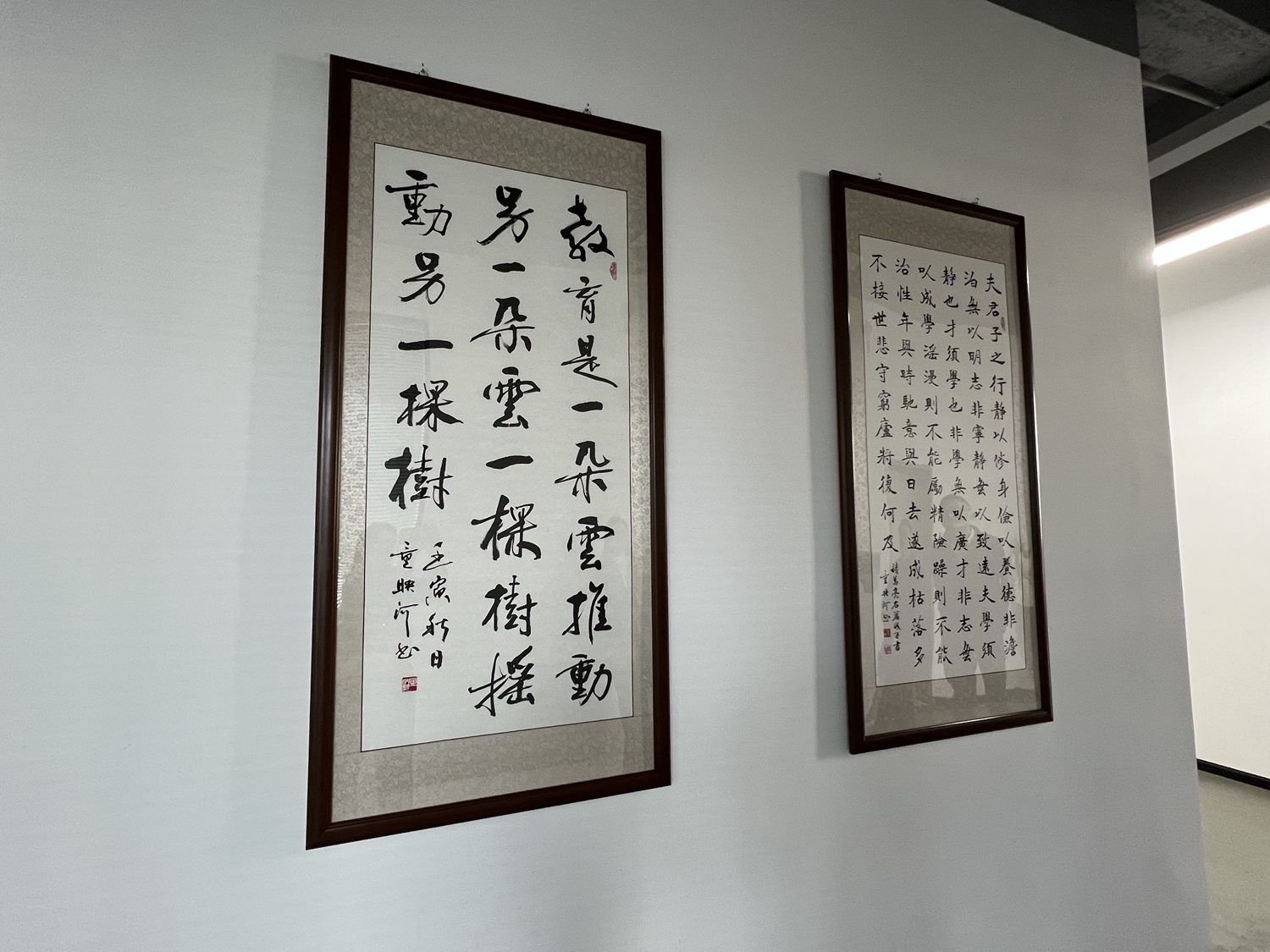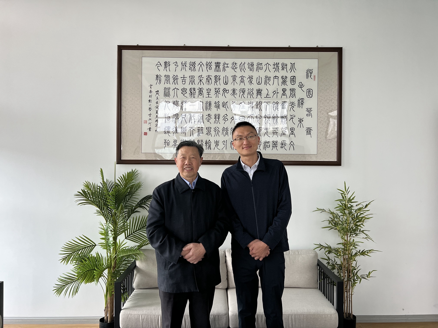 杨立高与公司高管一起与童映河老师一行参观公司并交流,他表示,童映河根据公司业务性质、装修特色,书写22幅书法作品,经装裱后悬挂在公司学习区、办公区和接待区,极大地提升了公司的文化品位,彰显了企业文化特色,更饱含母校对校友和校友企业的关心。