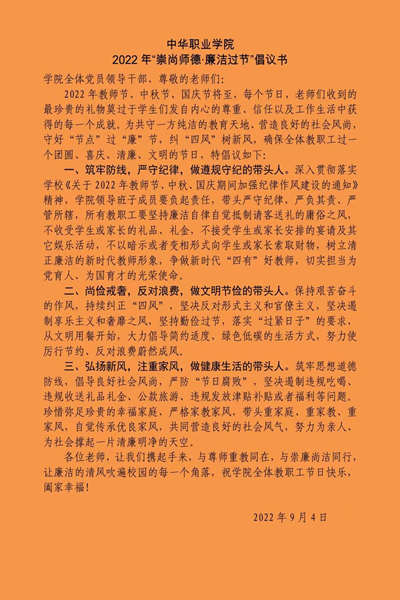 教师节、中秋节、国庆节将至,为防范关键节点腐败廉洁风险,做到早提醒、早预防、早纠治,近日,中华职业学院以活动倡廉,开展2022年“崇尚师德廉洁过节”倡议行动,深入推进作风建设,持续营造风清气正的节日氛围。