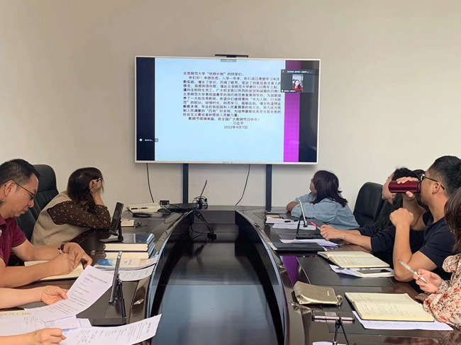 9月30日中午,国际语言文化学院线上线下同步开展教职工大会并组织开展理论学习。党委书记杨秀伟、院长刘代容、学院党委副书记兼纪委书记俞虹及其他班子成员、科室负责人在博远楼405线下参加会议。会议由杨秀伟主持。