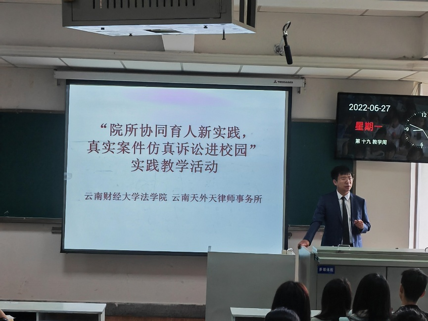 近日,法学院联合云南天外天律师事务所在2021-2022学年夏季小学期开展为期四周的“院所协同育人新实践,真实案件仿真诉讼进校园”系列实践教学活动。基于真实案件原始卷宗材料的个案全程仿真诉讼实践教学在全国尚属首创,为培养德才兼备的卓越法治人才、提升学生实践实务能力做出了新的教学探索。