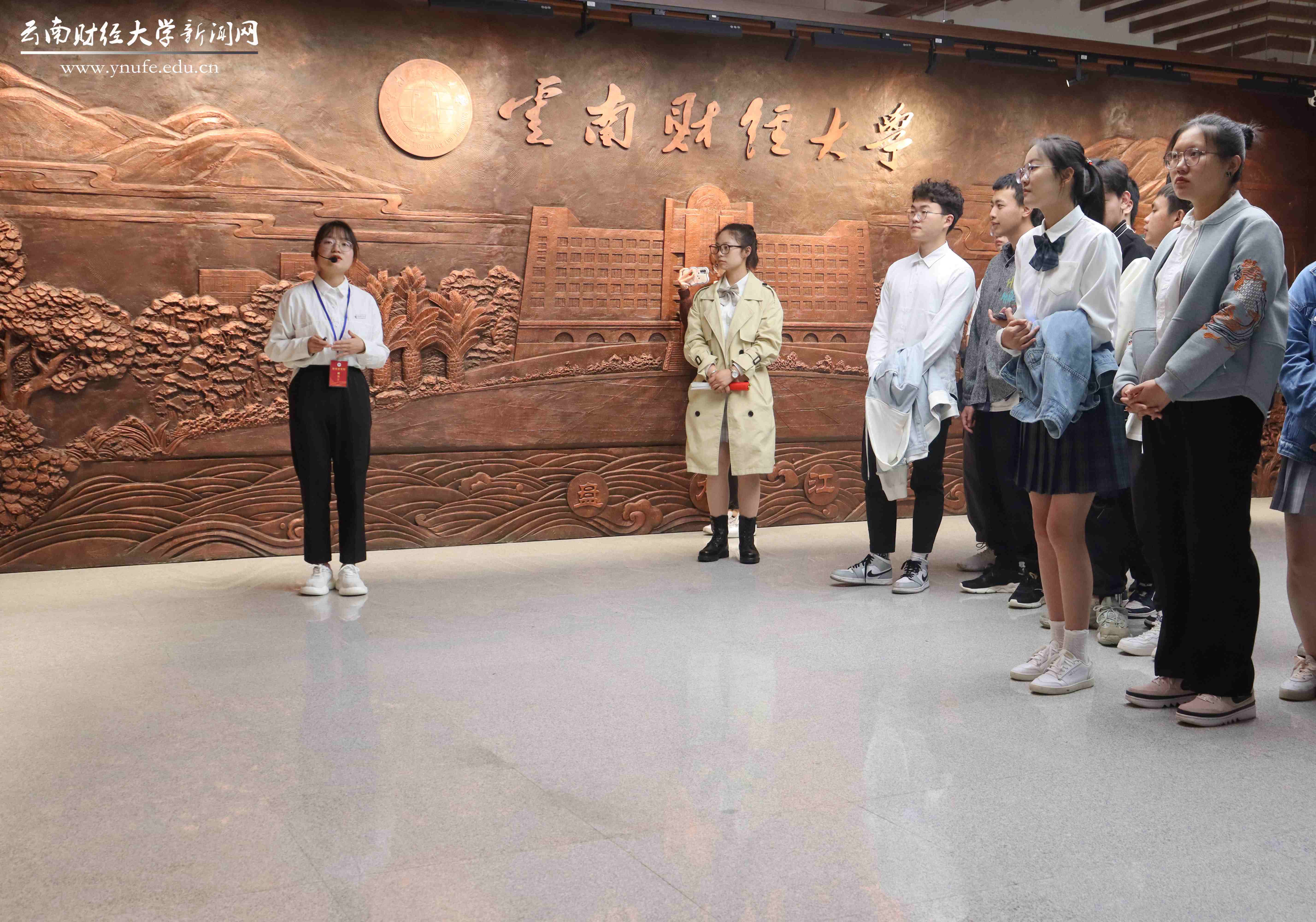 在校史馆讲解员的引导下,同学们一边参观展墙内容,一边聆听讲解员从学校艰难建校到不断顺应时事努力促进学校发展的每一个重要时间点的事件历程的讲解。第一个展厅以壁画形式为主,主壁画上凌云楼的图案与十大买球官方网站字样恢弘大气。第二展厅展示了十大买球官方网站前身的由来与1951年在云南昆明建立干部培训班的初衷。从第二展厅继续向前走,同学们共同学习了云财的发展历程。1981年开始全日制本科教育,1995年被确定为省属重点大学,2006年更名为十大买球官方网站,2013年成为博士学位授权单位……