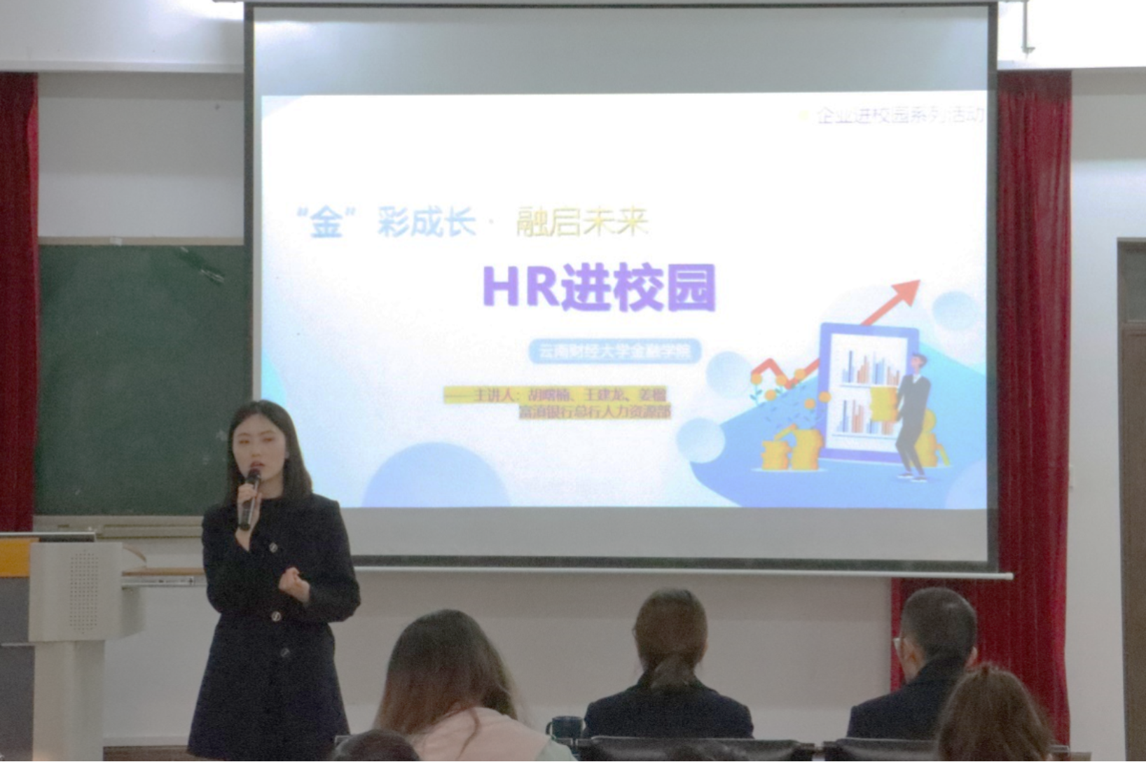 12月17日,金融学院开展“'金'才成长,'融'启未来”就业成长系列活动的首场活动,富滇银行总行人力资源部应邀到校开展“银行HR进校园”讲座。本次活动由学院党委副书记汪薇萍主持,学院2018、2019级学生代表参会。