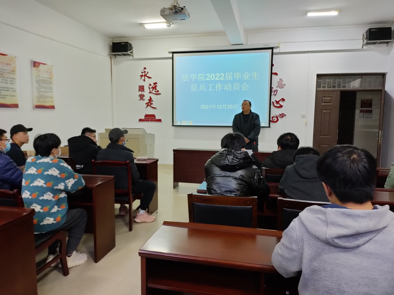 为进一步做好2022年春季征兵宣传动员工作,激励和引导法学院2022届毕业生投身军营,报效祖国,12月30日,法学院在博远楼305室召开2022届毕业生征兵工作动员会。