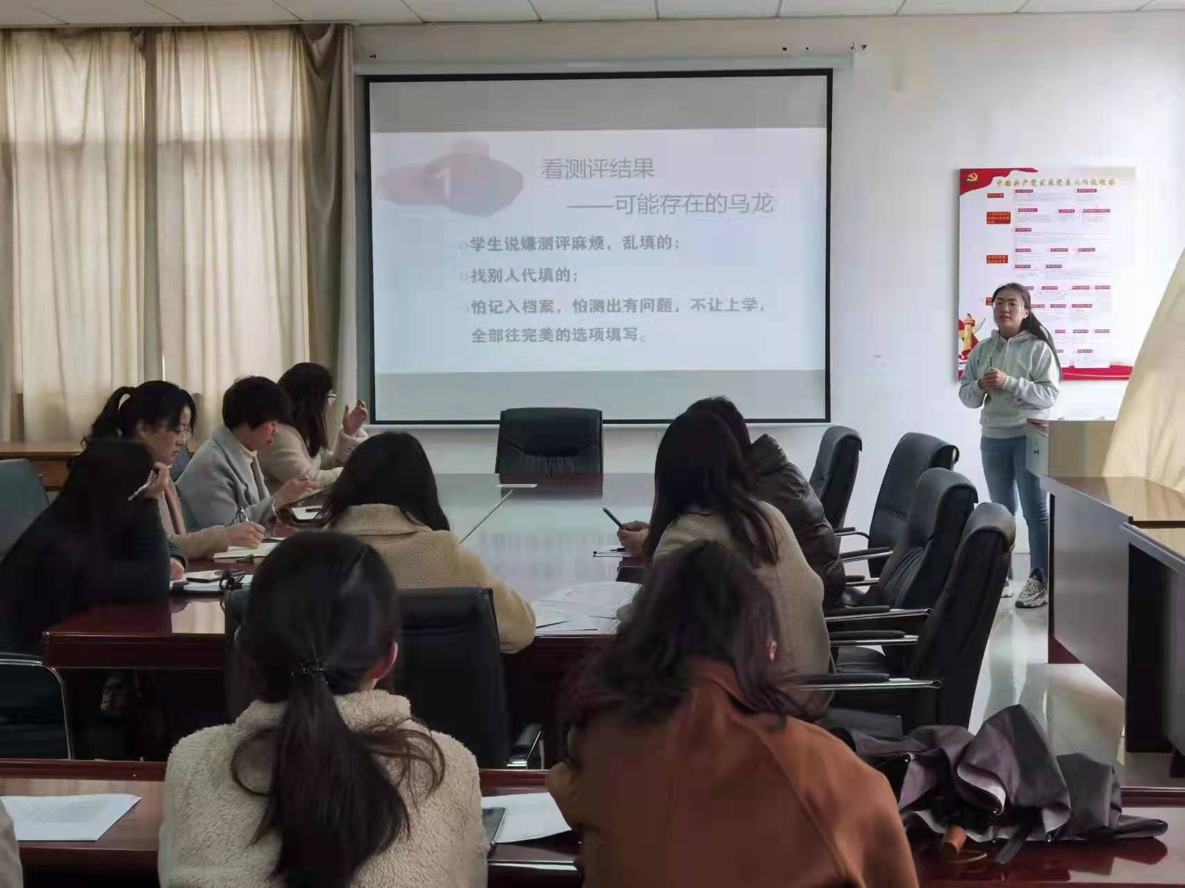 陈瑜婕讲解了如何看待心理测评结果以及各个指标的含义,并针对心理谈话提出了几点建议,一是各班辅导员及班主任应当重点关注同学是否存在学业压力,生活经济压力或人际压力;二是了解其是否存在既往病史,定期了解复诊和治疗情况,及时劝导出现问题的同学寻求专业帮助;三是向各位辅导员及班主任讲解了出现心理问题后的处置流程以及专业帮助渠道。
