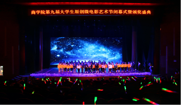 12月2日晚,商学院在北院汇文礼堂举行第九届大学生原创微电影艺术节余“影”绕梁闭幕式暨颁奖盛典。商学院党委书记王敏、党委副书记蒋见证、正处级辅导员杨世兵、学生科科长朱次毅、团委负责人刘煜以及研究生科字惠云、组织员陈叶、辅导员张倩、文欢,以及各家兄弟学院学生骨干代表参加活动。