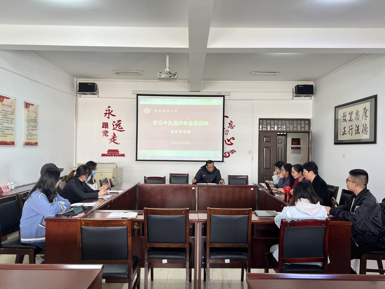 为认真学习贯彻党的十九届六中全会精神,12月10日中午,法学院党委在博远楼305会议室举行学习贯彻党的十九届六中全会精神专题学习会,学院党委副书记王俊领学,学院党委委员、各支部委员参加。