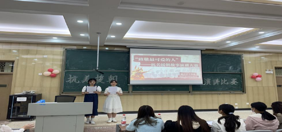为纪念中国人民志愿军抗美援朝出国作战71周年,10月16日,中华职业学院秘书学专业部在鹏云一栋111阶梯教室举办“致敬最可爱的人”——抗美援朝故事演讲比赛。本次比赛共有28支队伍参加,经过激烈比拼,黄于珈、陆成乐同学组成的“飞跃队”获一等奖。