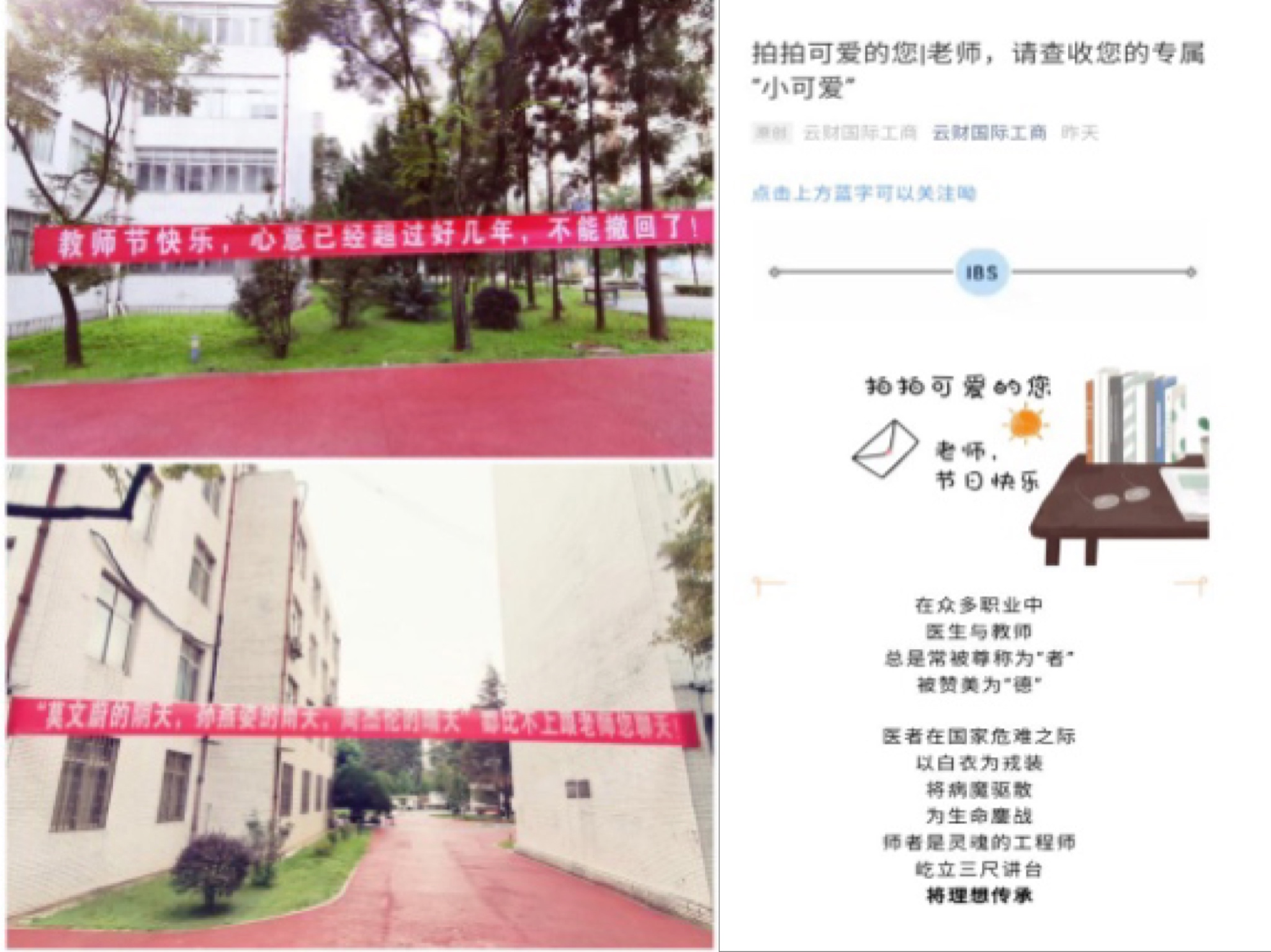教师节当天,同学们特地制作了创意横幅,如“莫文蔚的阴天,孙燕姿的雨天,周杰伦的晴天,都比不上跟老师您聊天”“教师节快乐,心意已经超过好几年,不能撤回了”等,向老师们“花式表白”。