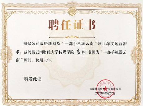 9月27日,买球传媒学院教师高阳博士接受云南腾云信息产业有限公司聘请,担任“一部手机游云南”顾问。