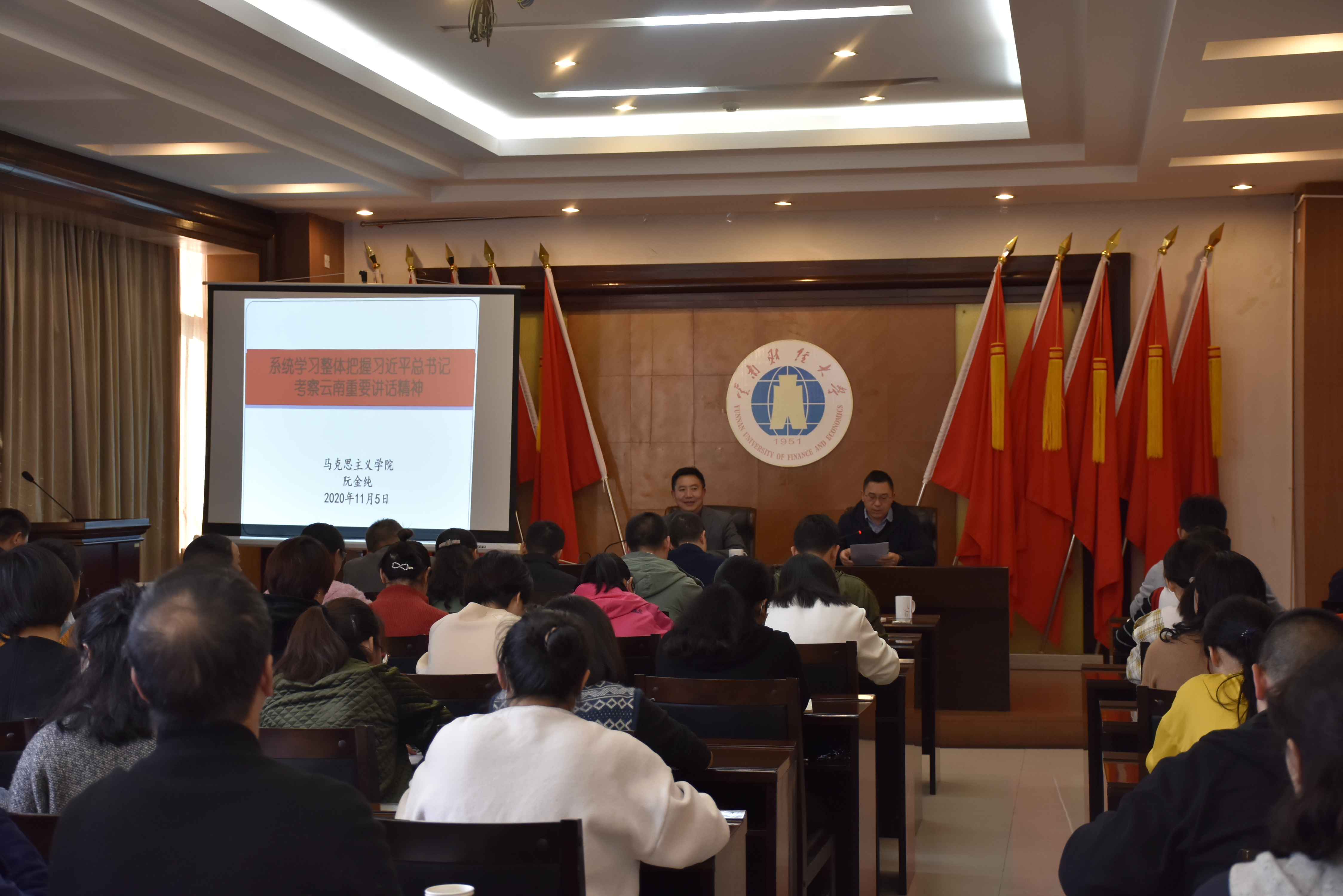 11月5日下午,后勤产业集团党委开展学习宣传贯彻习近平总书记考察云南重要讲话精神暨2020年“双百双进”宣讲活动,马克思主义学院院长、中共云南省委宣讲团成员阮金纯担任宣讲人,宣讲活动由集团党委副书记李晔宏主持,集团全体党员、入党积极分子和中层管理人员共80余人参加宣讲活动。