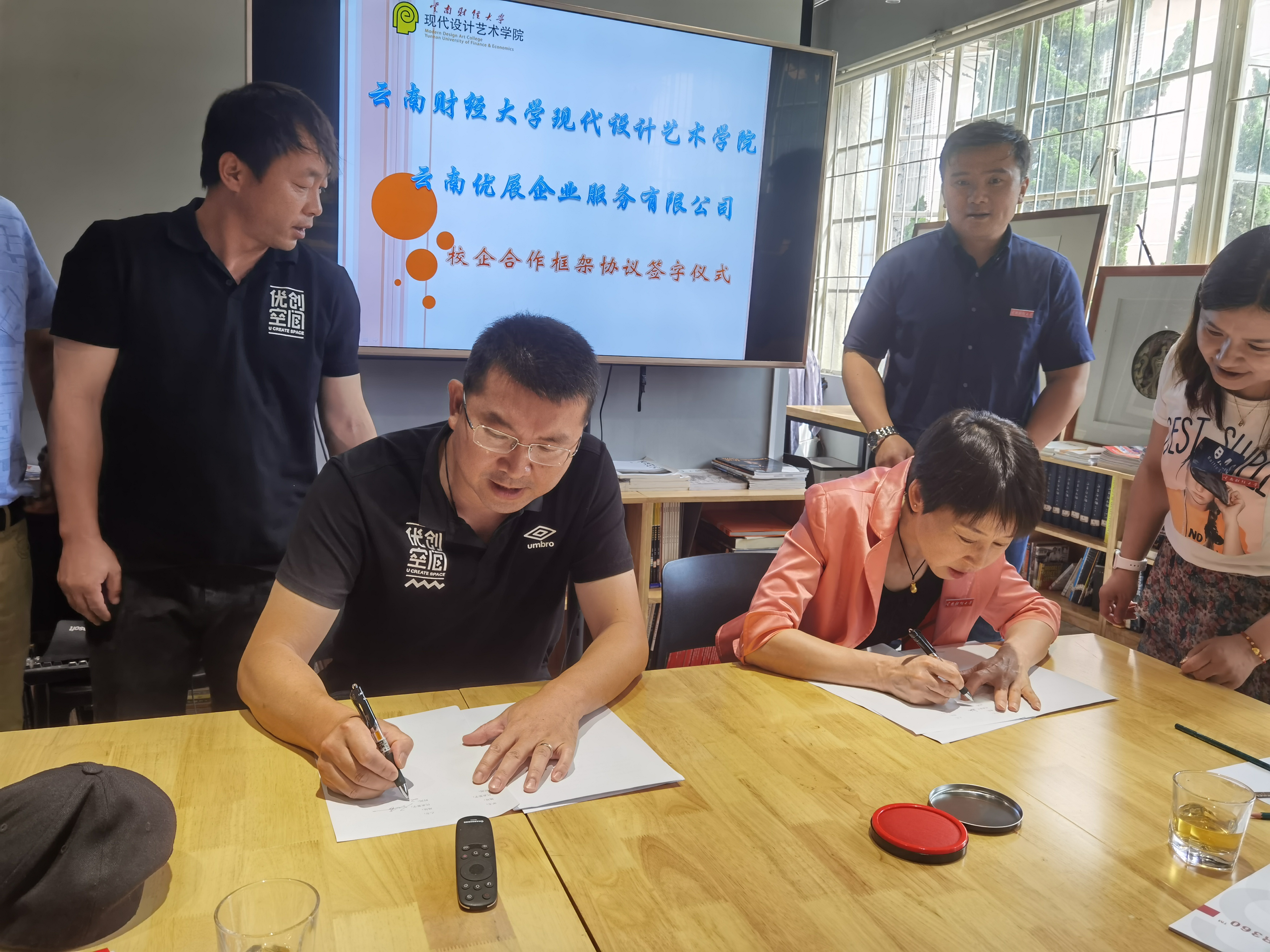 6月9日上午,现代设计艺术学院与云南优展企业服务有限公司在学院资料室签署战略合作协议,云南优展企业服务有限公司董事长石远与院长袁洪签署合作协议。云南优展企业服务有限公司党建负责人张宁等七人,院党委书记赵玮、副书记沙磊、学生科科长黄思佳、办公室教师毛艳梅参加签约仪式,仪式由办公室主任陈丽花主持。