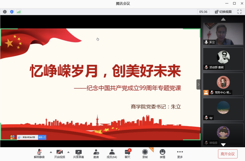 为庆祝中国共产党成立99周年,商学院于7月3日下午通过线上会议的方式开展庆祝中国共产党成立99周年专题党课,院党委书记朱立担任主讲人,商学院全体师生党员参与学习。