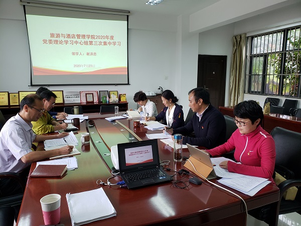 7月23日上午,旅游与酒店管理学院党委理论学习中心组举行2020年第3次集中学习,专题学习坚持党对经济工作的集中统一领导以及新发展理念的深刻内涵。学院全体党委委员参加学习,学习由张向英同志主持,谢洪忠同志领学。
