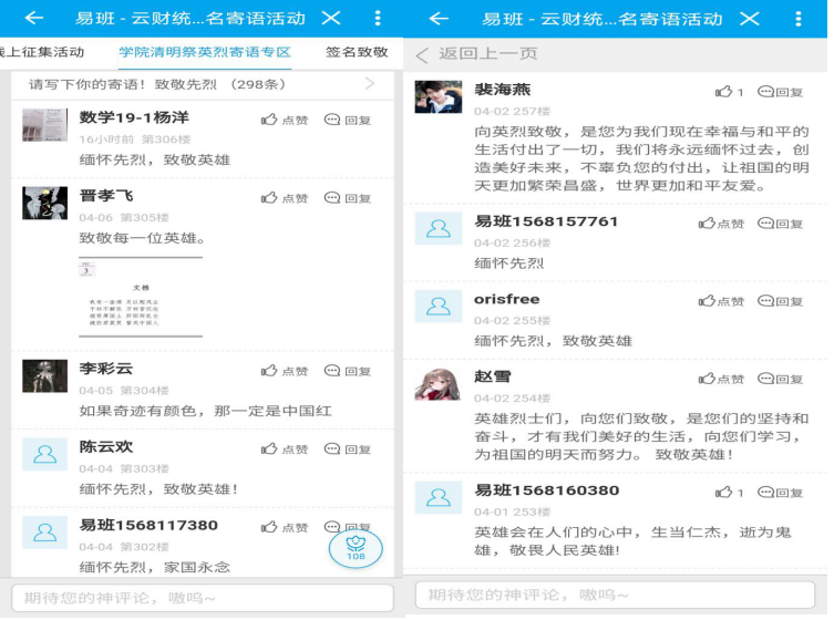 为确保活动正常进行,学院结合实际,通过QQ群、易班网先后下发通知,安排部署“致敬·2020清明祭英烈”网上祭扫英烈活动及网上云签名寄语活动。在易班网,搭建了《云财统数“清明祭英烈”云签名寄语活动》轻应用,开展云签名寄语活动。统数学子们在寄语专区写下寄语,致敬英烈。截至活动结束时,共有1124人次访问了活动轻应用,浏览量2040次,有484名同学参与了云签名致敬英烈活动,学院清明祭英烈寄语专区共收到302条寄语。