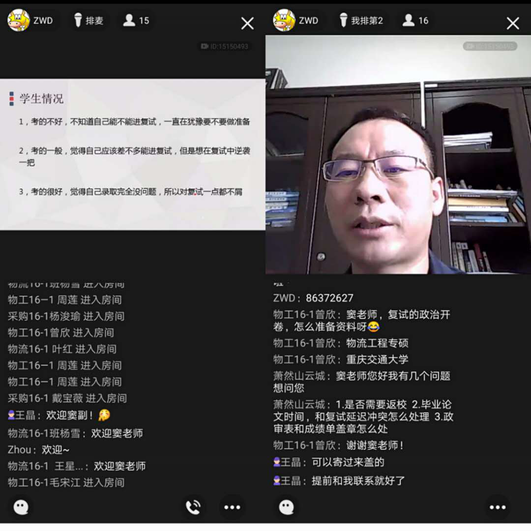 窦志武认真总结分析了考研学生的实际情况和不同类型院校考研复试的基本特点,紧紧围绕复试注意事项、复试流程、复试备考重点、复试常见问题等具体内容进行备考指导,对同学们提出的问题进行了专业、细致的解答,为同学们备战考研复试指出了着力点和努力方向。