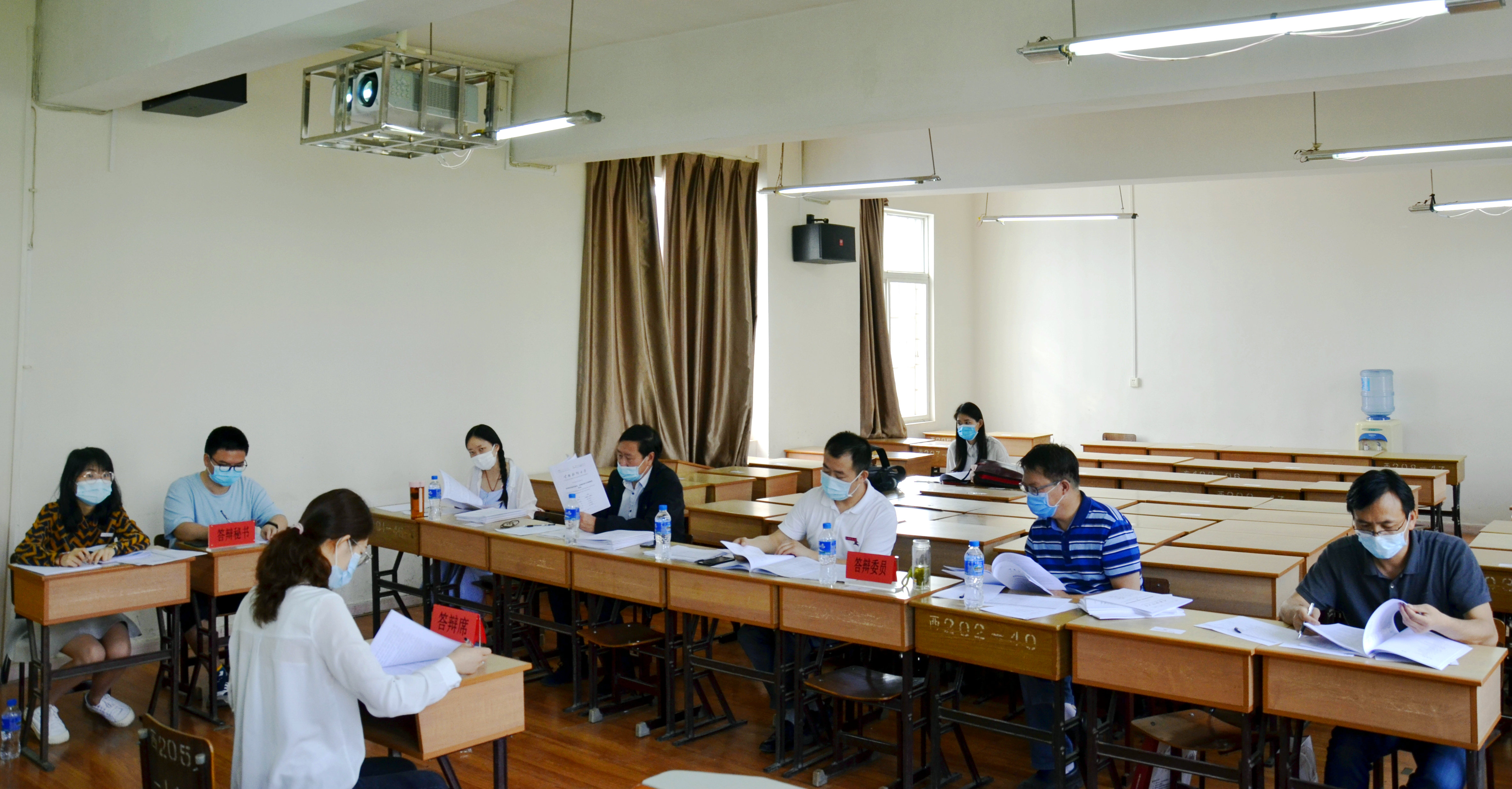参加现场答辩的学生在测量体温、消毒后方可进入答辩候场区域,答辩时需全程佩戴口罩。
