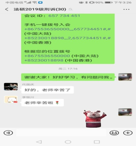 学院党委书记谢维华老师担任2019级法本法硕《商法专题讲座》课程,在上课之前学习了雨课堂的操作流程,在儿子的鼎力帮助下选用雨课堂、腾讯课堂、腾讯会议三个平台进行试教。在上课前建立了课程微信群,推送中国政法大学赵旭东教授讲授的商法学供同学学习,推送了第一讲的参考文献供同学阅读,并在微信群里征求同学对网课平台的接受程度,决定选用腾迅课堂直播教学,腾讯会议作备选。授课采用直播形式,开课前进行了一次签到,临近结束又签了一次,直播效果还不错,课后在微信群里跟同学进行了交流。