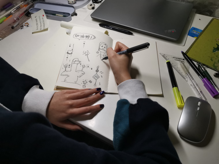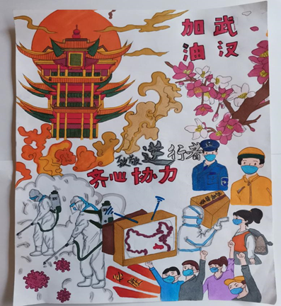 国美17-4、会澳17-1、金英17-2、会澳19-1、会澳19-3团支部鼓励团员们积极创作,将对抗疫一线的牵挂转化为文创作品,把这份挂念化作手中流淌的旋律,纸上跃动的线条,为武汉加油,为中国加油!