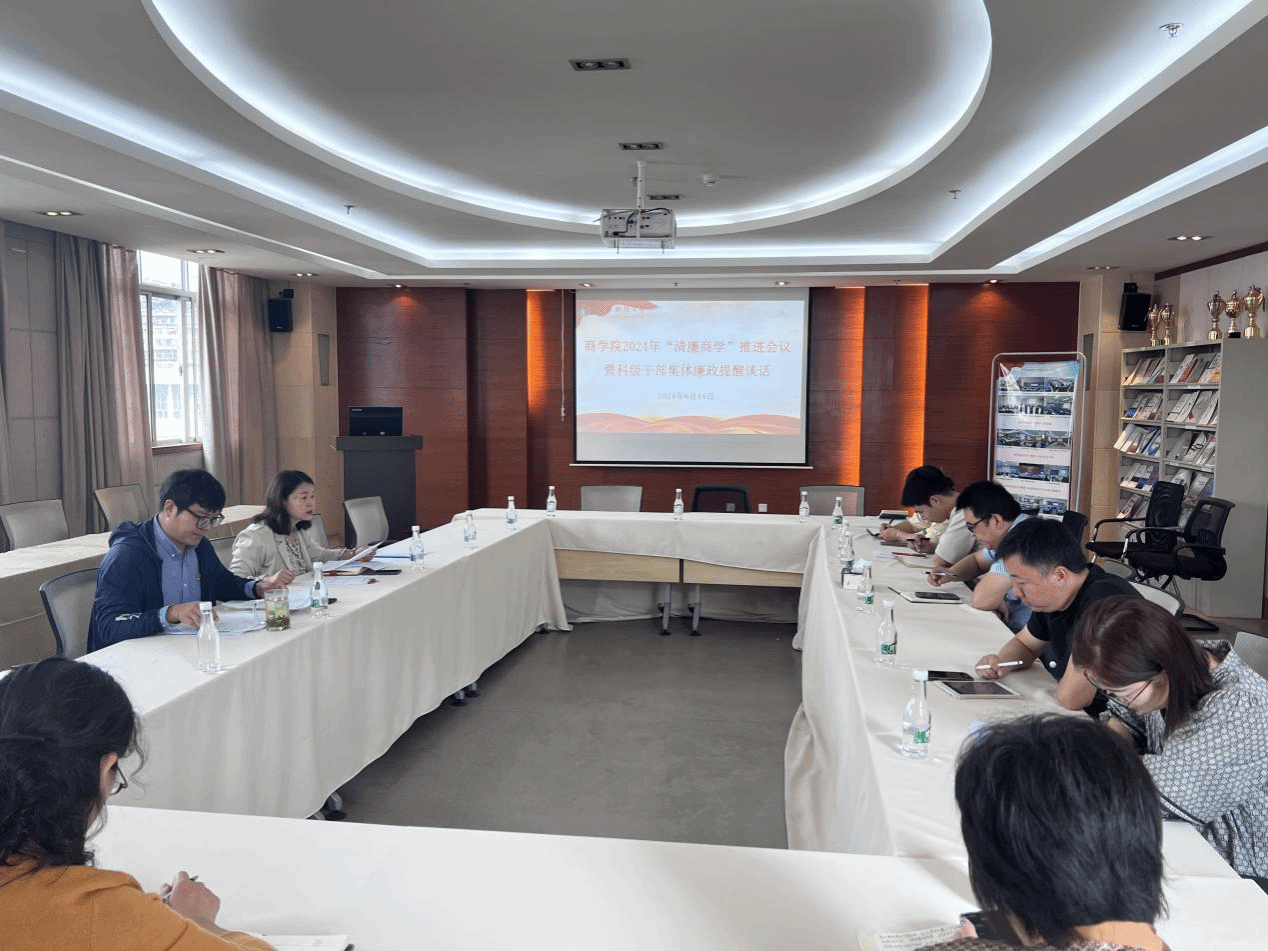 根据学校巡察整改、学院党风廉政建设、“清廉商学”建设和党纪学习教育工作要求,6月14日,商学院在逸夫楼521会议室召开2024年“清廉商学”推进会议暨科级干部集体廉政提醒谈话。商学院党委书记王敏开展廉政提醒谈话,各科室负责人参加。会议由商学院党委副书记兼纪委书记朱次毅主持。