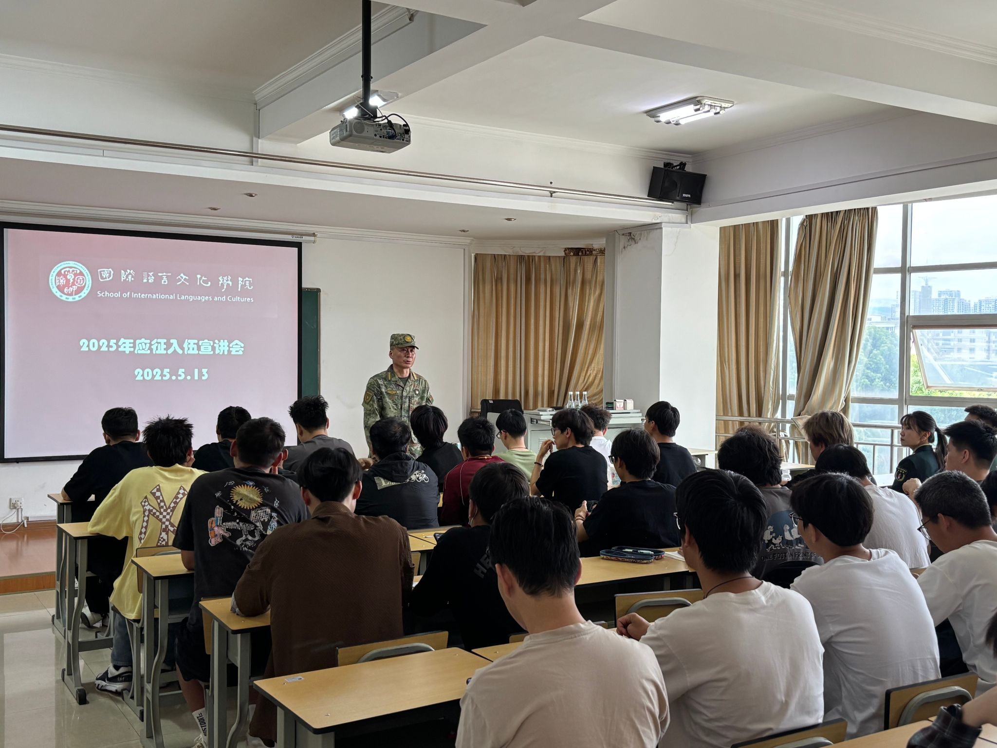 为激发学生们的参军热情,鼓励更多优秀青年投身国防事业,为强军兴军贡献青春力量,5月13日,国际语言文化学院在博远楼415会议室组织开展征兵宣讲会,学校武装部教师王明水、优秀退役大学生张焜、罗善妍应邀与同学们分享军旅故事,解读征兵政策,积极开展宣讲动员。
