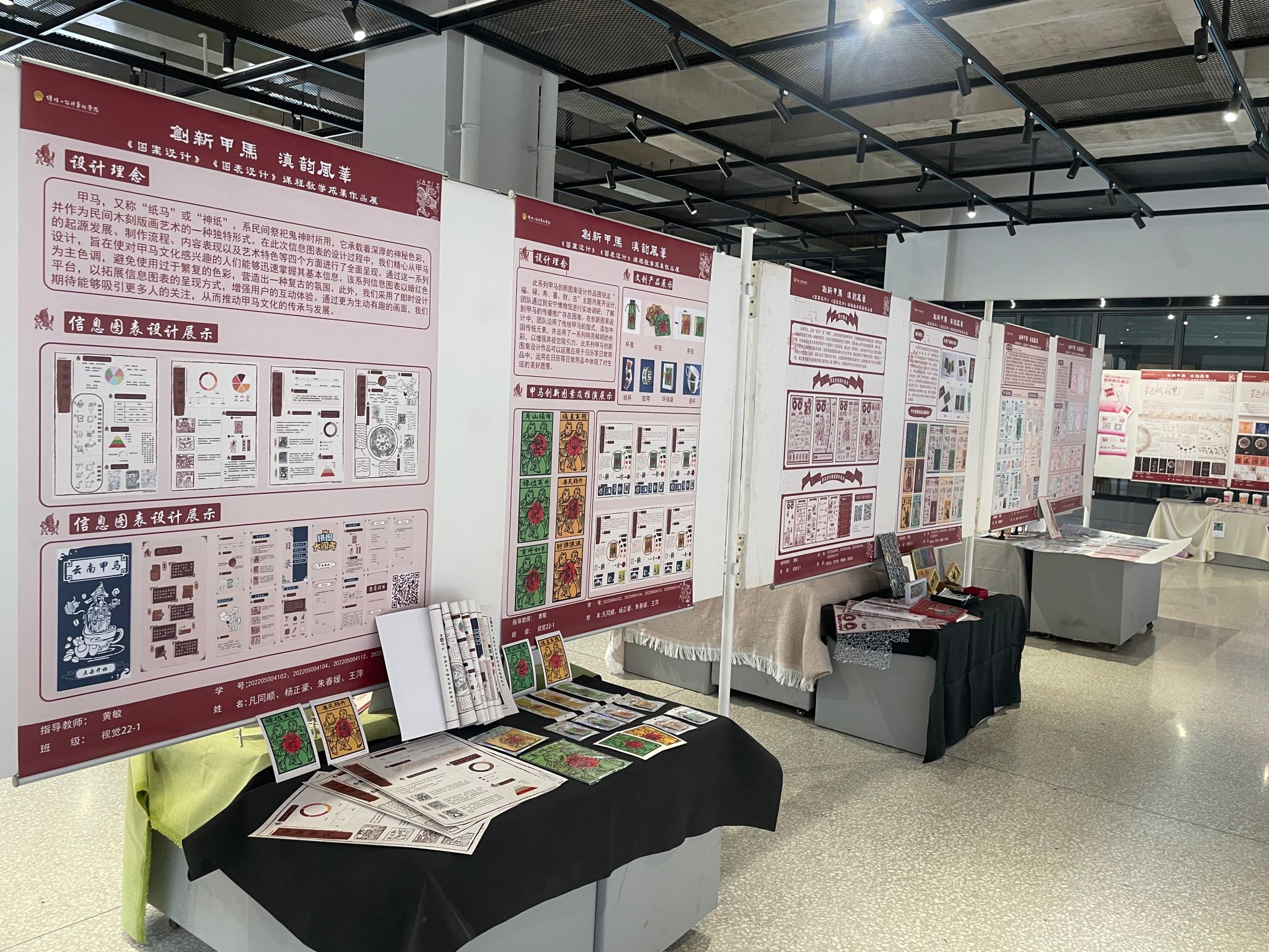 展览旨在通过设计作品展现大学生对云南甲马文化的理解和思考,同时注重融入思政元素,通过视觉可视化设计、图案设计的方式,将云南甲马的历史、文化、特征等元素巧妙地融入设计作品中,展现了福、禄、寿、喜、财、吉系列甲马创新图案设计作品以及衍生的系列文创产品。通过设计课题,学生深入了解了云南甲马的起源、发展、表现内容、艺术特征等知识,提高了文化素养和艺术修养。同时,展览也为学生提供了一个表现云南甲马独特艺术魅力和深厚文化底蕴的平台,有助于学生探寻云南民族艺术创新形式,活态化传承云南非遗文化的新途径。