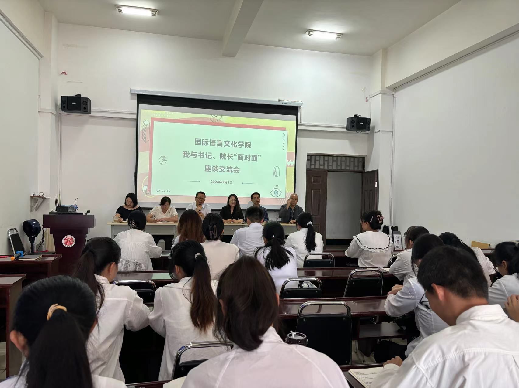 7月1日,国际语言文化学院在博远楼403学术报告厅开展“我与书记院长面对面”座谈交流会。学院党委书记杨秀伟,院长刘代容,党委副书记俞虹,副院长曾骞、段春锦、孙婷婷,团委书记马婧,辅导员李良辉以及各班学生代表参加活动。