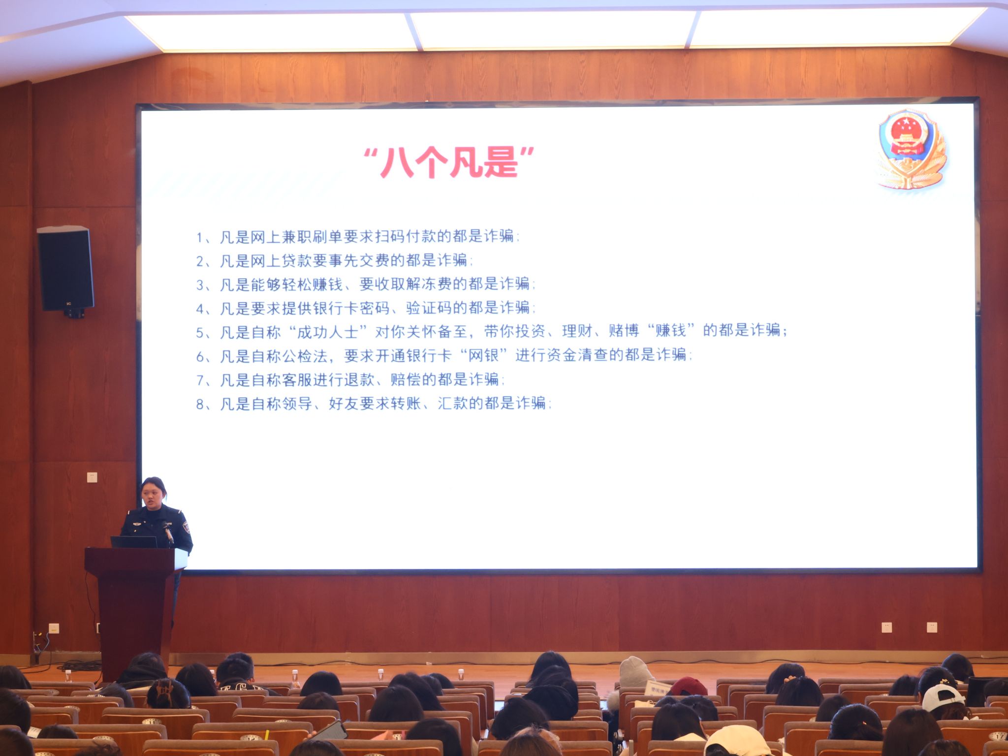 为增强师生安全防范意识,筑牢校园安全防线,11月21日下午,学生处、保卫学校安宁校区举办交通安全和防范电信网络诈骗知识讲座。安宁校区师生代表及物业管理人员300余人参加,保卫处副处长荆斌主持活动。