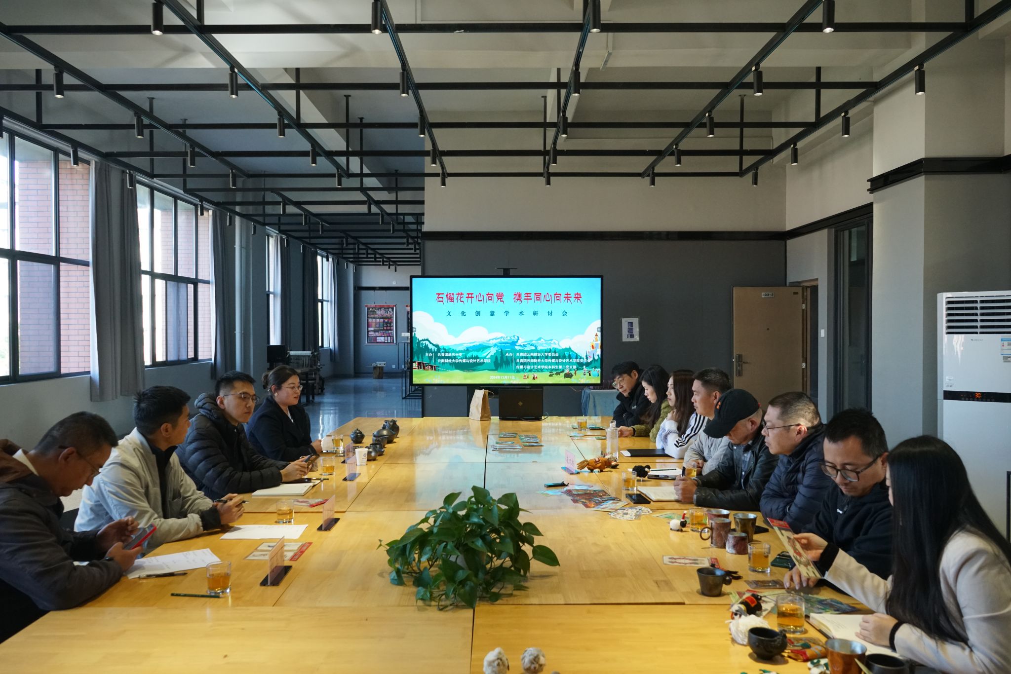 下午还举行了青年返乡兴乡就业创业工作指导交流会暨文化创意学术研讨会。唐浚泷、迪庆州青创中心秘书长刘玉峰,驻安宁校区各学院的迪庆籍学生和2025届、2026届意向报考大学生志愿服务西部计划的学生参加座谈,围绕青年返乡兴乡、开展基层服务和就业创业等方面的地方需求、政策扶持、备考事宜等进行了交流。文创研讨环节,唐浚泷一行与学院产品设计、视觉传达设计两个专业的骨干教师针对校地文创产品合作意向、课题共建、设计内容、产品生产等进行了深入探讨。