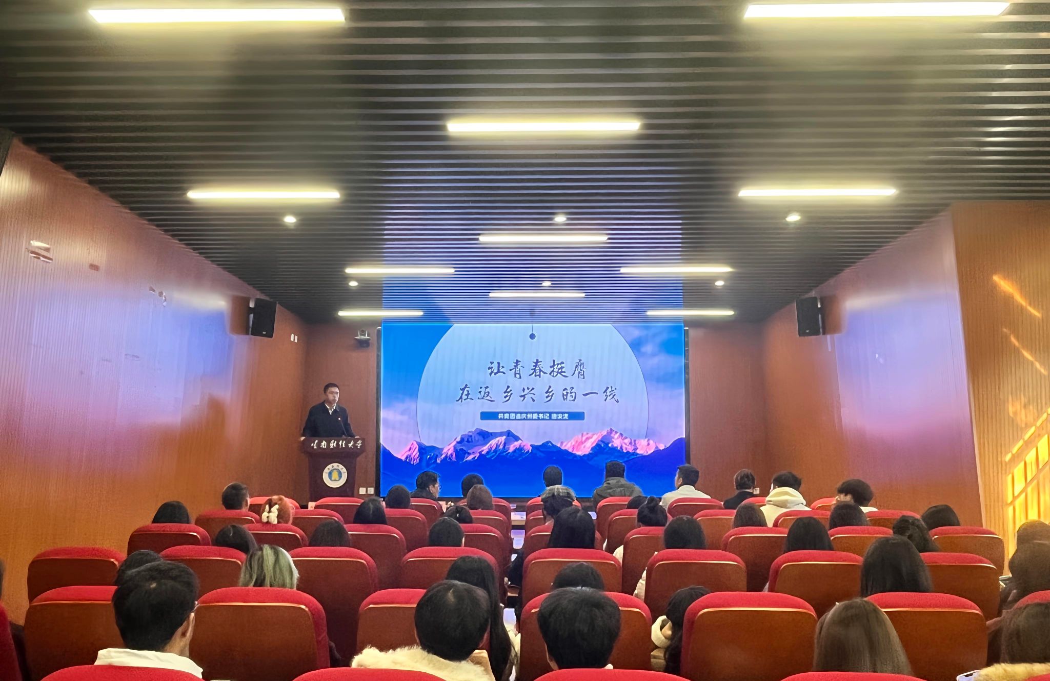 随后,唐浚泷以“让青春挺膺在返乡兴乡的一线”为主题开展党课。他通过团州委创作的微短剧向大家分享了迪庆州返乡青年的先进事迹和香格里拉的人文风貌,并结合自身工作经历与迪庆州发展实际,鼓励在场青年学生牢记习近平总书记对广大青年服务人民、挺膺担当的寄语,做“有理想、敢担当、能吃苦、肯奋斗”的新时代青年,积极投身返乡兴乡事业,为党和国家的事业作贡献。