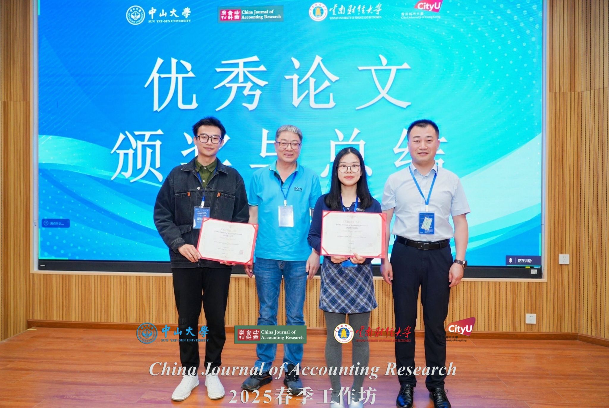 经过严格筛选,组委会共评选出两篇优秀论文:“Political Homophily in Supply Chain Relationships”和“Risk Ripples: From Firm Disclosures to ETF Pricing”。余怒涛教授、中山大学管理学院谭劲松教授为获奖论文颁奖。
