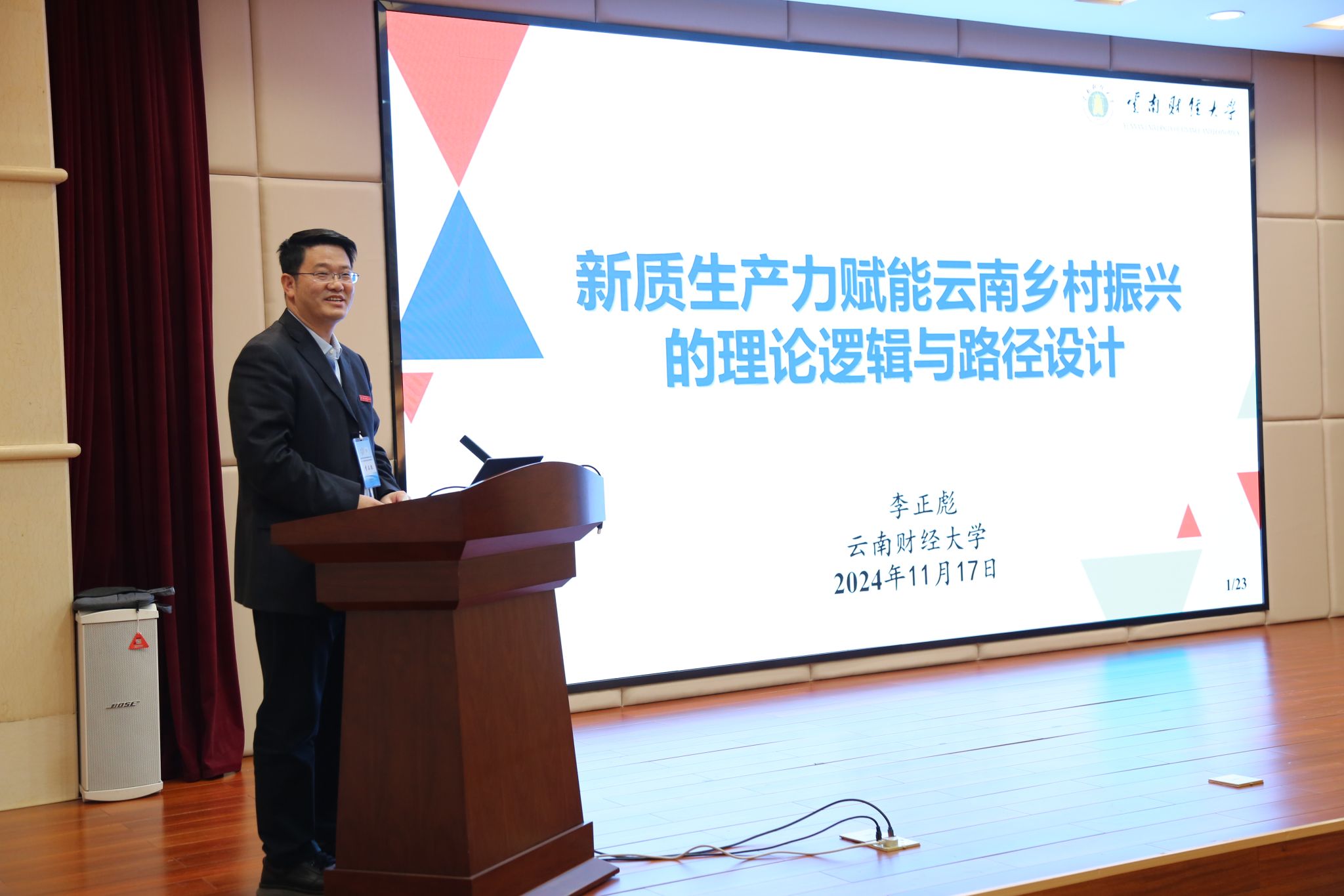李正彪教授以《新质生产力赋能云南乡村振兴的理论逻辑与路径设计》为主题进行主旨发言,剖析了新质生产力在驱动云南乡村振兴进程中的核心作用及其具体实施路径。他从乡村振兴的时代背景与深远意义引出新质生产力的丰富内涵,运用索洛经济增长模型、马克思主义生产关系理论以及具有中国特色的区域经济理论体系,围绕新质生产力助推云南乡村振兴进行理论分析。在此基础上他提出,培训人才、普及技术,技术驱动、生态共赢,整合资源、优化配置是新质生产力赋能云南乡村振兴的三大关键路径。