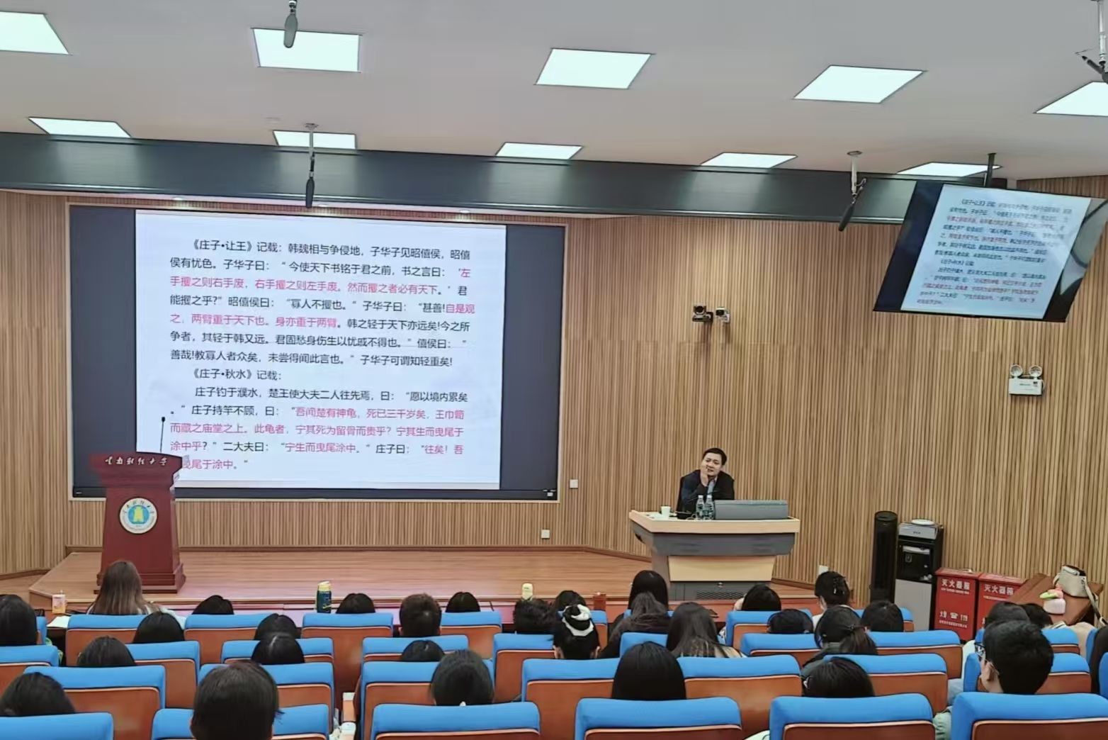 11月22日,2024年云岭大讲堂(云财讲坛)第八讲《向庄子学习人生智慧》讲座在学校行远楼D101学术报告厅举办,讲座由科学技术处与国际语言文化学院联合主办,云南大学文学院教授、博士生导师、云南省国学研究会会长谢青松受邀主讲,国际语言文化学院党委副书记俞虹主持讲座。
