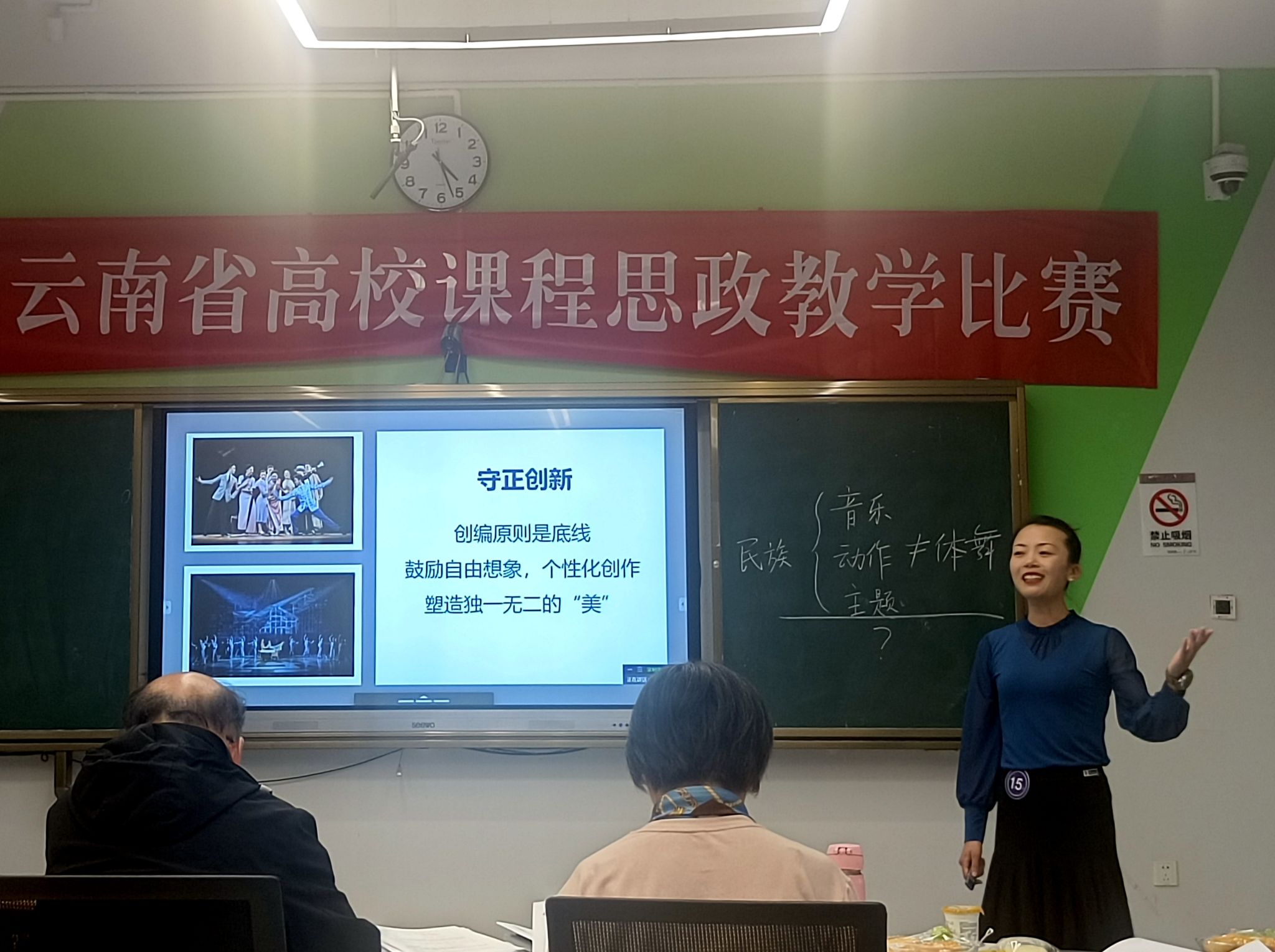 黄娅的参赛课程是《体育舞蹈》,也是唯一晋级省级决赛的《大学体育》课程。她在短短20分钟的“体育舞蹈创编”课堂教学演示中,紧紧围绕育人目标,巧妙地将文化自信、守正创新等思政元素融入教学,通过扎实的专业技术示范、精彩生动的理论讲解、新颖有趣的案例教学,充分发挥了体育舞蹈既是体育运动又是舞蹈艺术的双重优势特色,获得了评审的高度肯定。