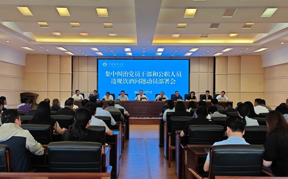 5月7日上午,十大买球官方网站召开集中纠治党员干部和公职人员违规饮酒问题动员部署会,深入学习贯彻习近平总书记关于加强党的作风建设的重要论述,结合深入贯彻中央八项规定精神学习教育,落实省委有关工作要求,对学校集中纠治党员干部和公职人员违规饮酒问题作出部署安排。校党委书记陈红传达云南省集中纠治党员干部和公职人员违规饮酒问题动员部署会议精神,就学校贯彻落实相关工作提出要求。校党委委员、纪委书记、监察专员业光远主持会议,全体校领导、党委委员出席会议。